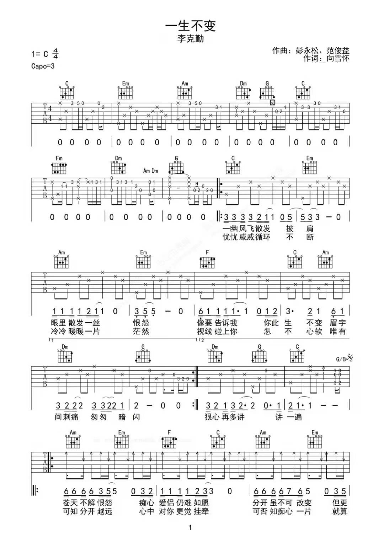 曲谱介绍: 李克勤《一生不变》吉他谱_C调吉他弹唱谱