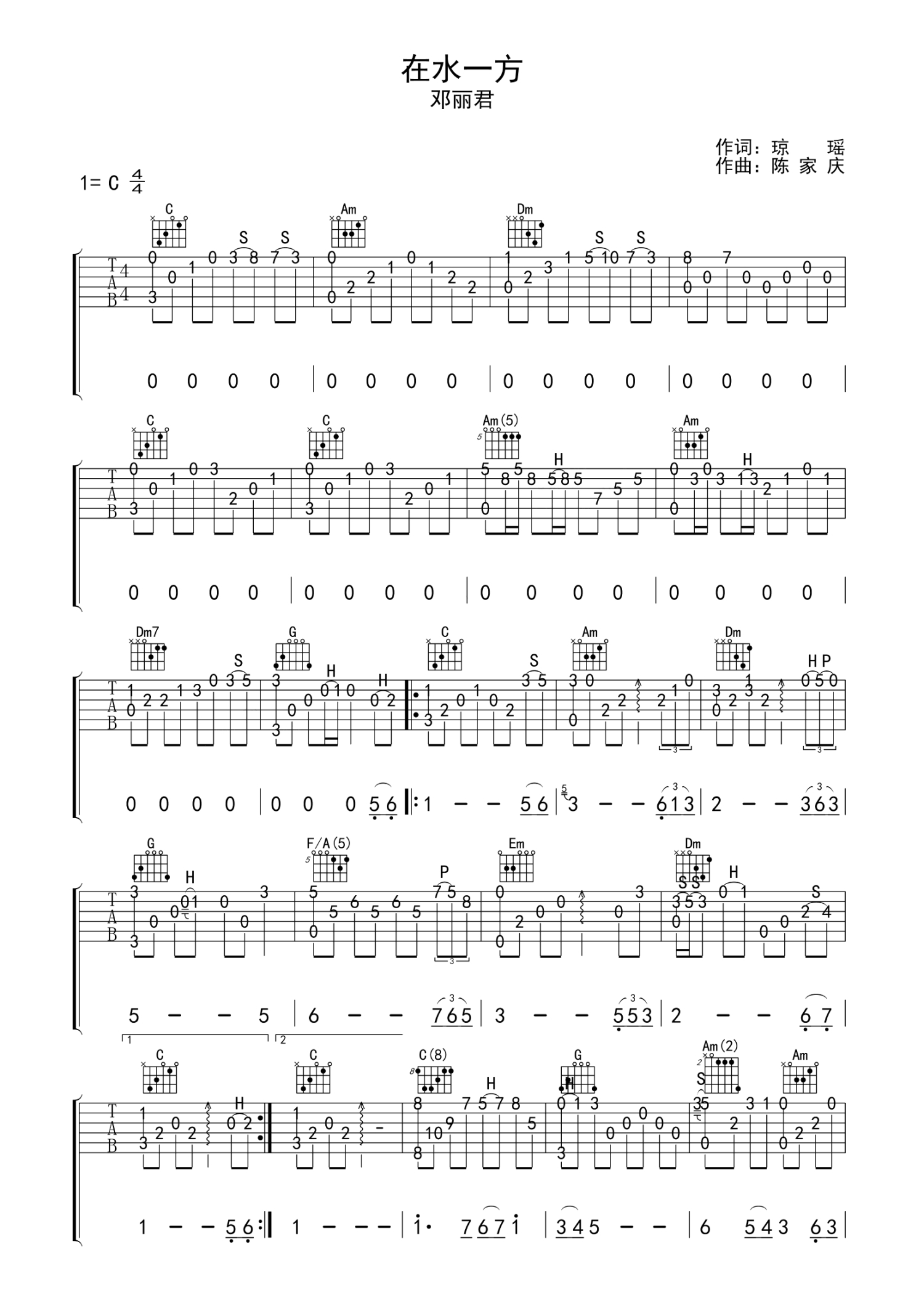 曲谱介绍: 邓丽君《在水一方》吉他谱_C调吉他独奏谱