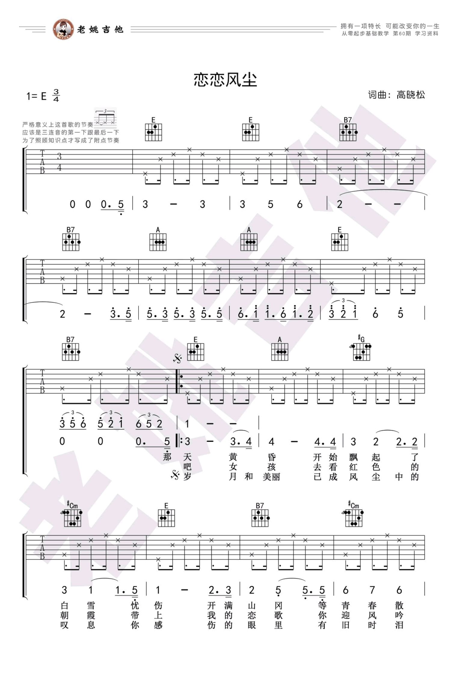 曲谱介绍: 《恋恋风尘》吉他谱,老狼的经典代表歌曲,高晓松词曲创作的校园民谣,恋恋风尘六线谱, 本期从零起步基础教学,配合这首动听的歌曲,为同学们讲解附点节奏的练习。大家喜爱的solo部分,可以参照曲谱歌词上的数字进行演奏。