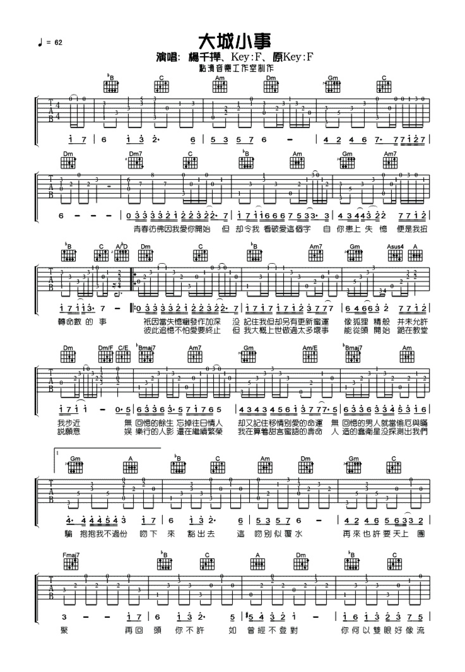 曲谱介绍: 杨千嬅《大城小事》吉他谱_F调吉他弹唱谱