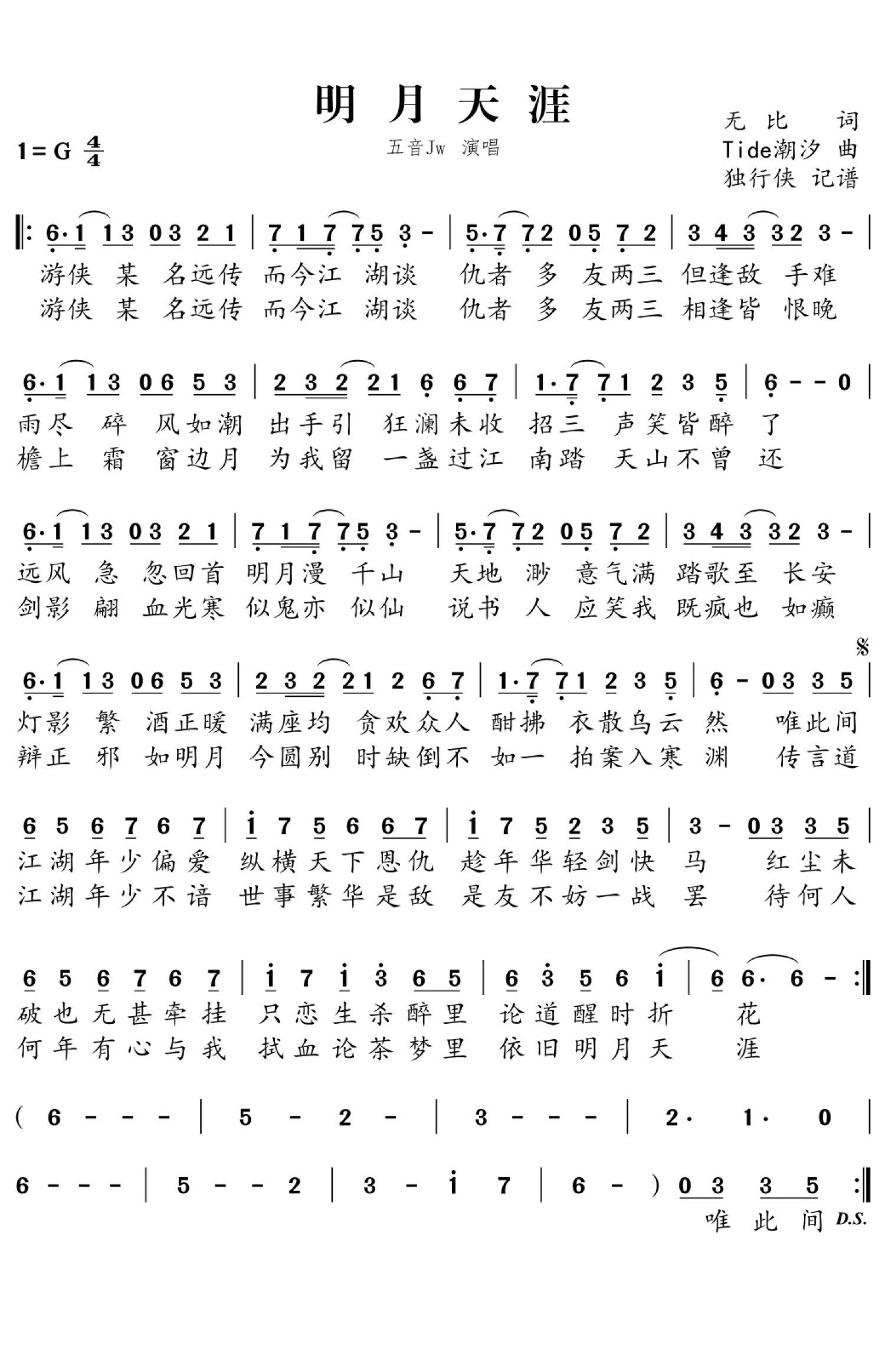 曲谱介绍: 五音Jw《明月天涯》歌词_简谱