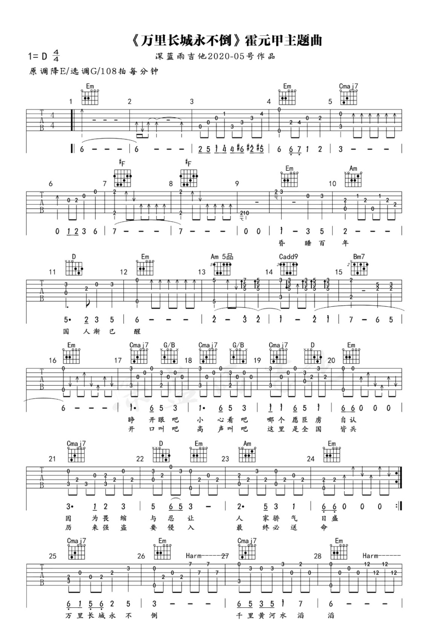 曲谱介绍: 叶振棠《万里长城永不倒》吉他谱_G调吉他独奏谱