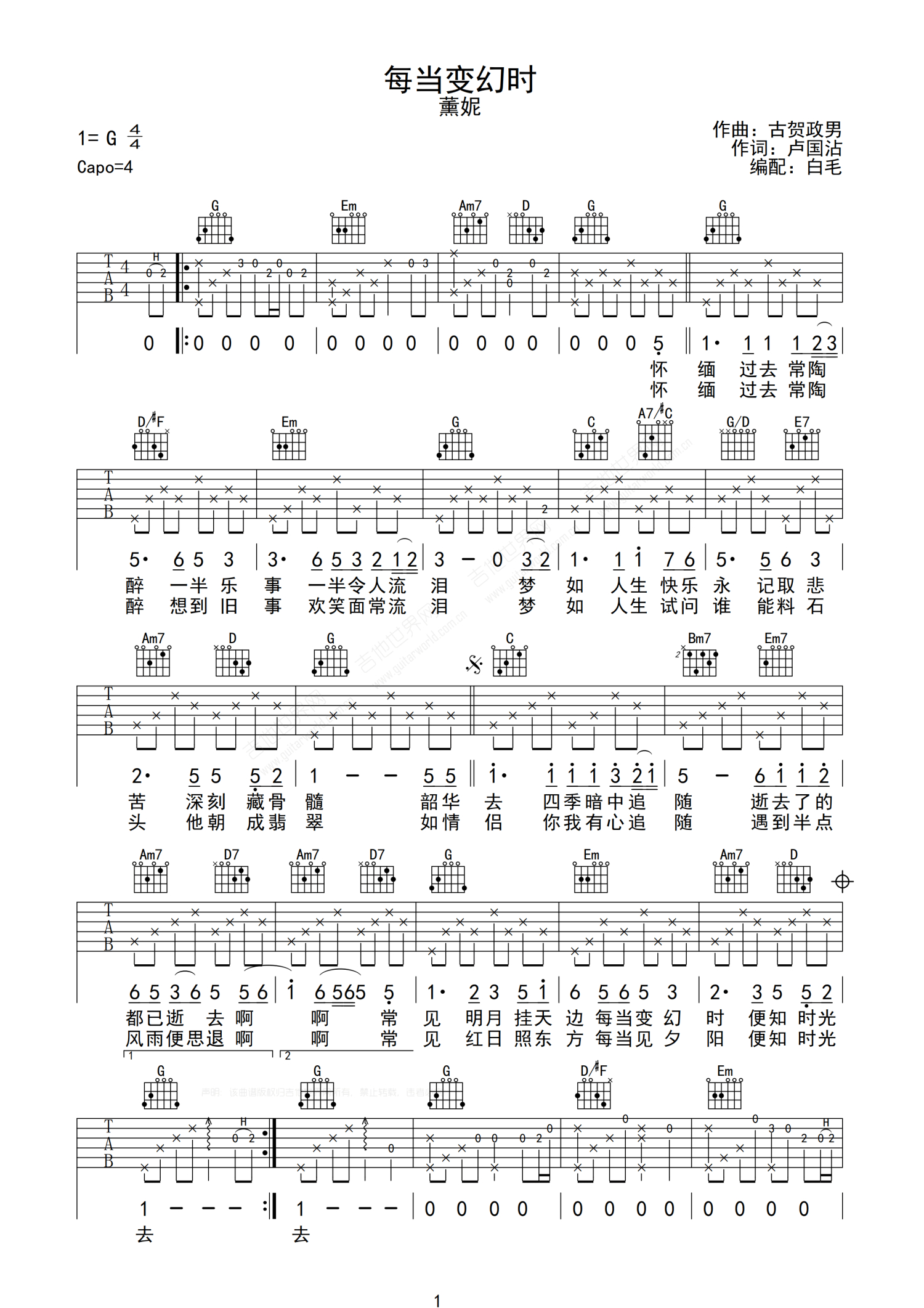 曲谱介绍: 温拿《每当变幻时》吉他谱_G调吉他弹唱谱