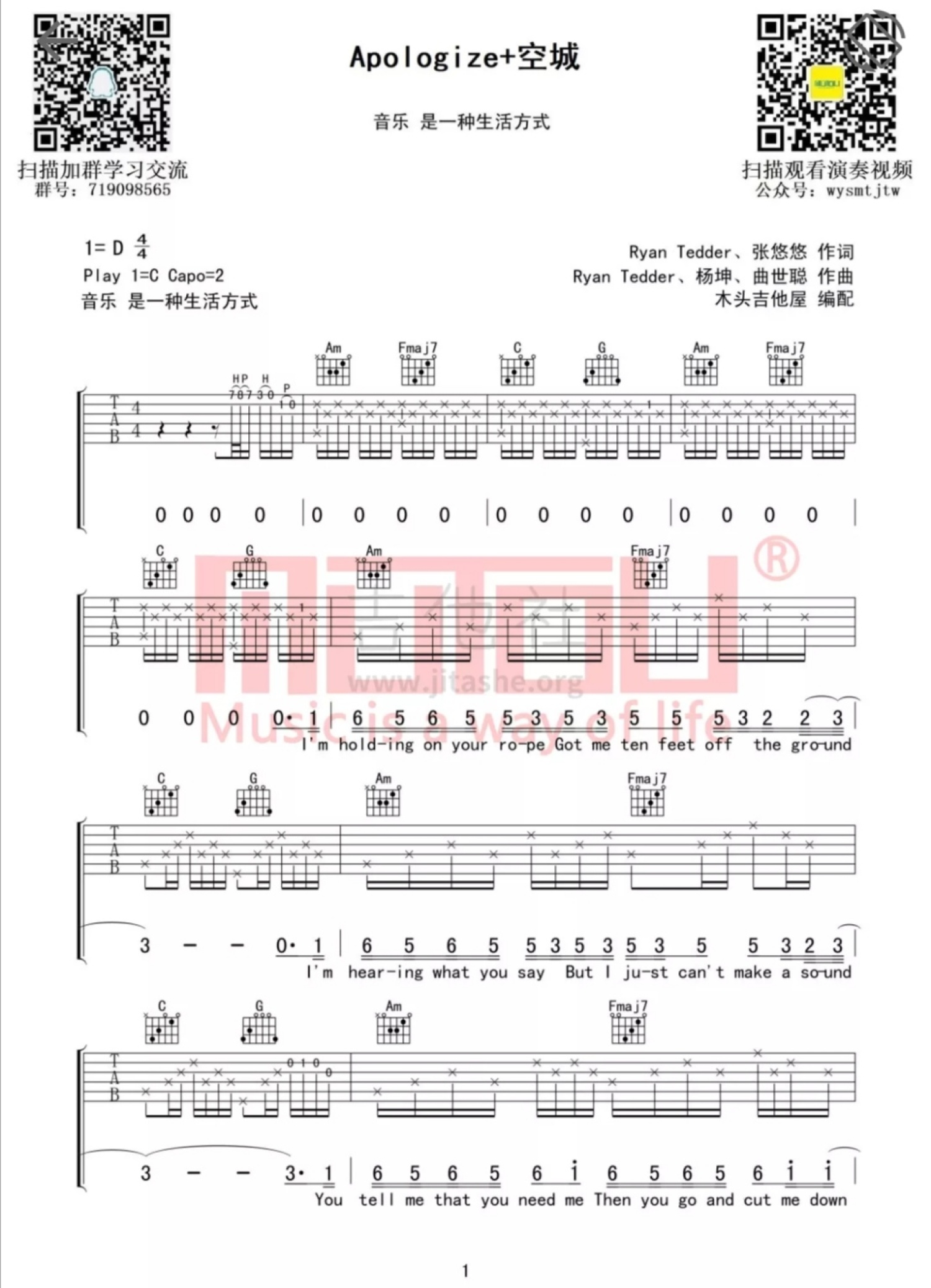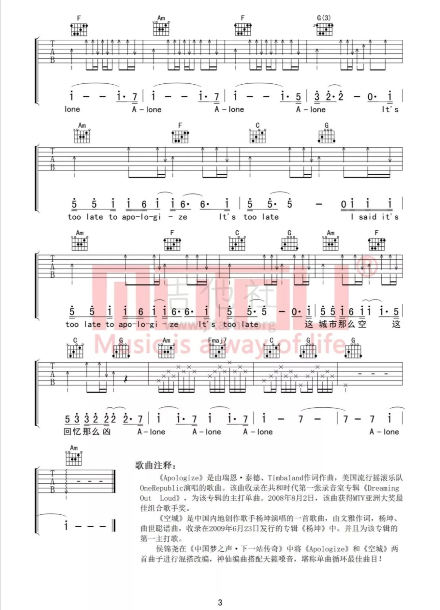 当前位置:琴谱网>吉他弹唱>apologize+空城