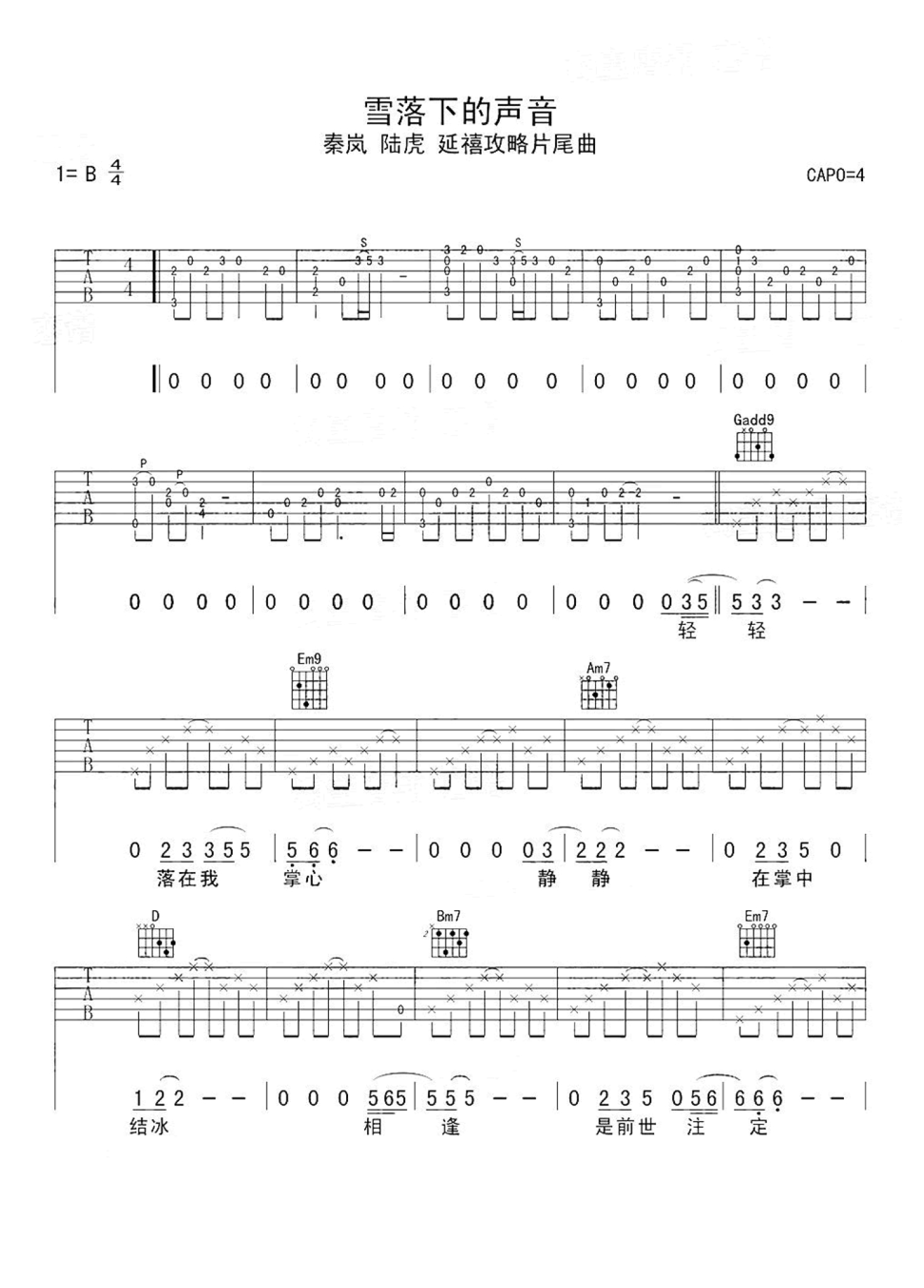 雪落下的声音吉他谱 - 秦岚/陆虎 - B调吉他弹唱谱