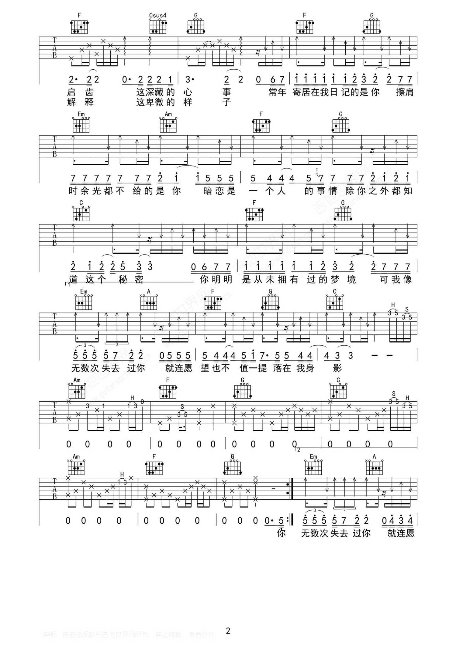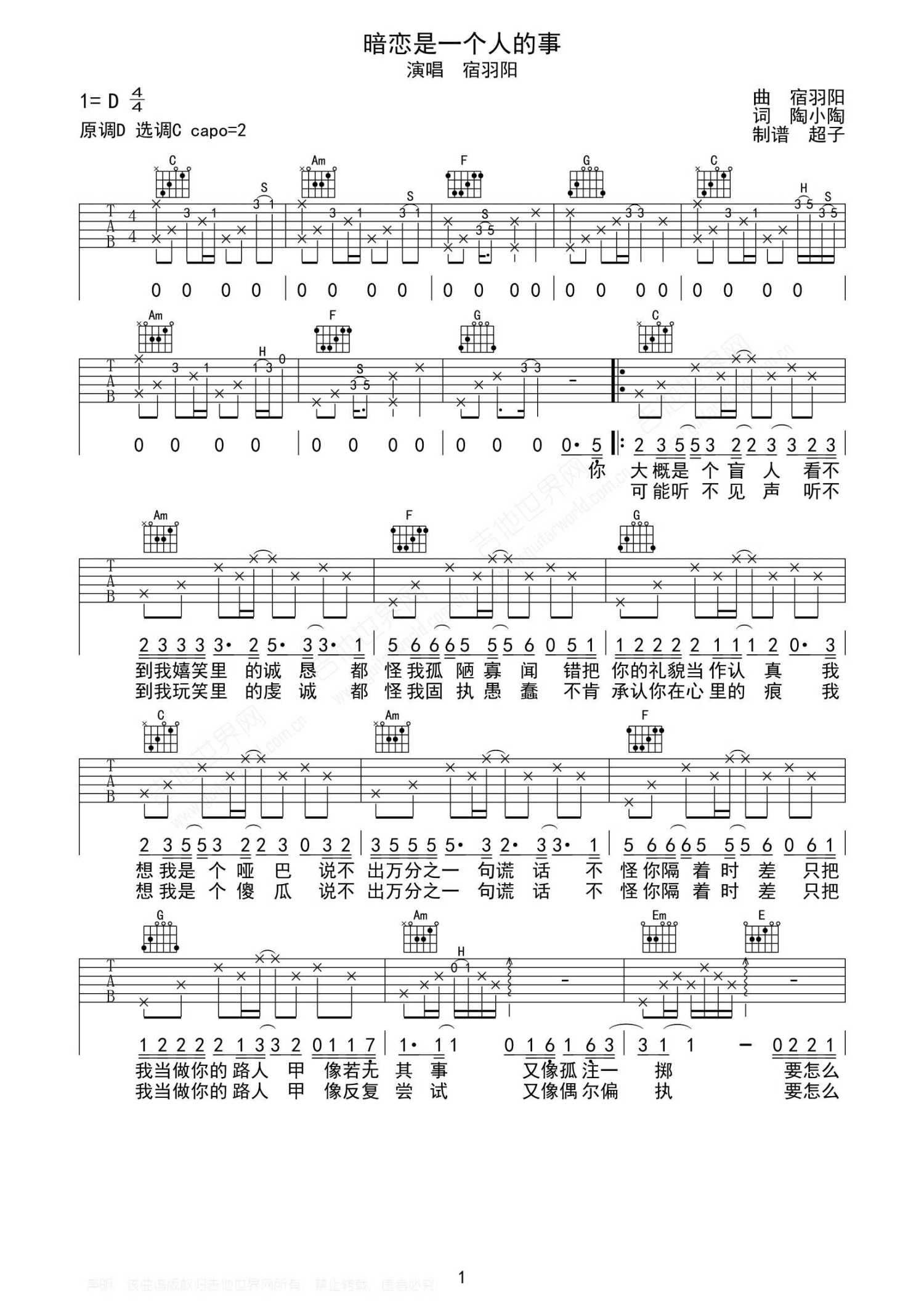 曲谱介绍: 宿羽阳《暗恋是一个人的事》吉他谱_C调吉他弹唱谱