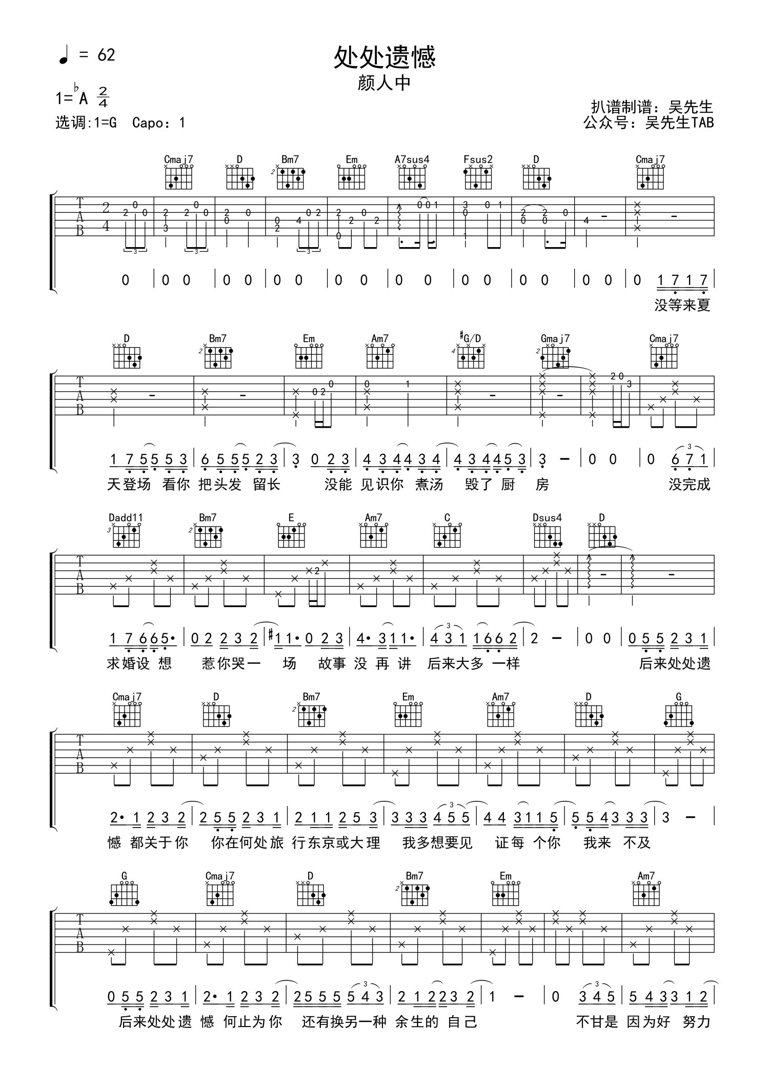 • 处处遗憾吉他谱 - 颜人中 - G调吉他弹唱谱第1张