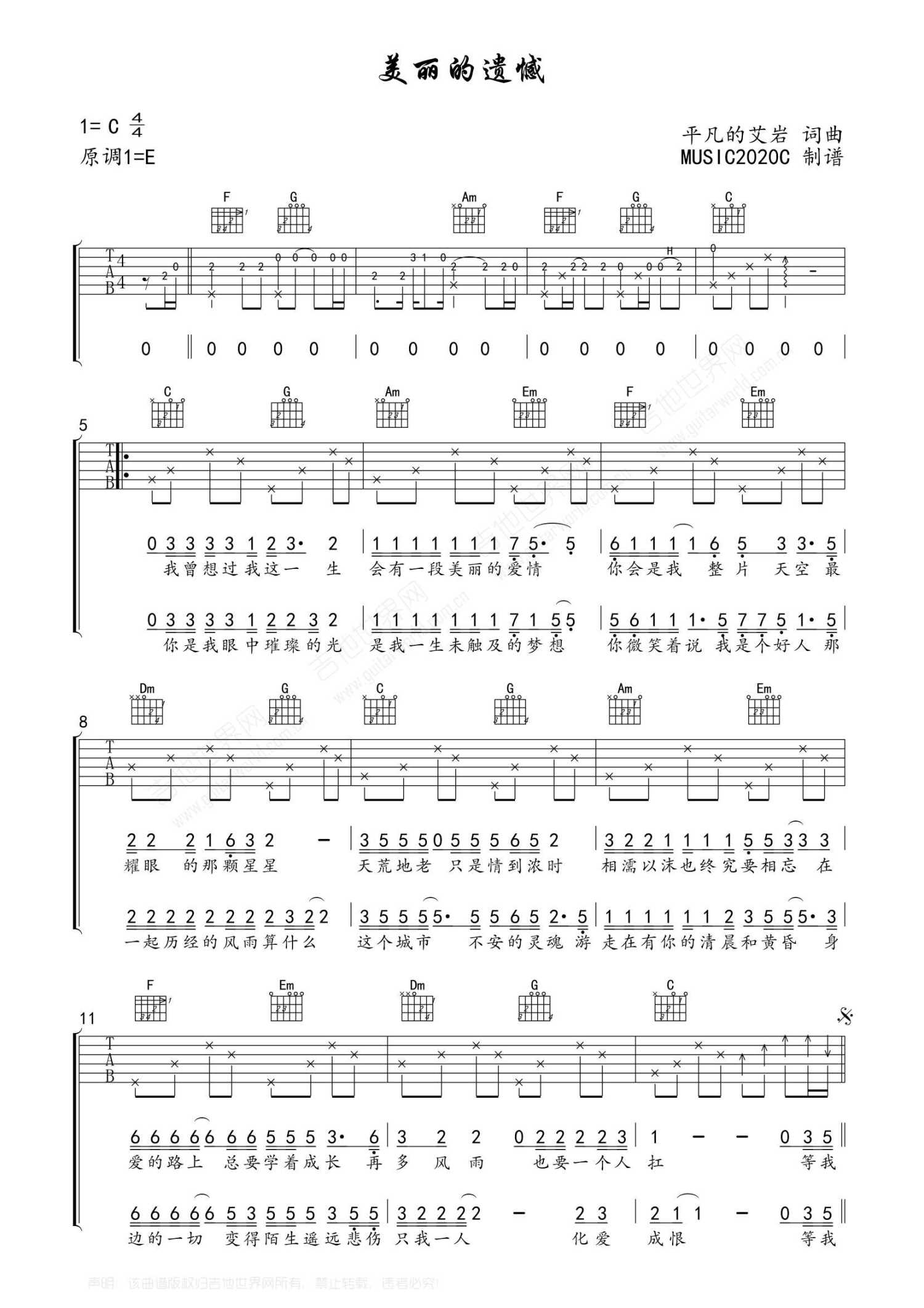 曲谱介绍: 平凡的艾岩《美丽的遗憾》吉他谱_C调吉他弹唱谱