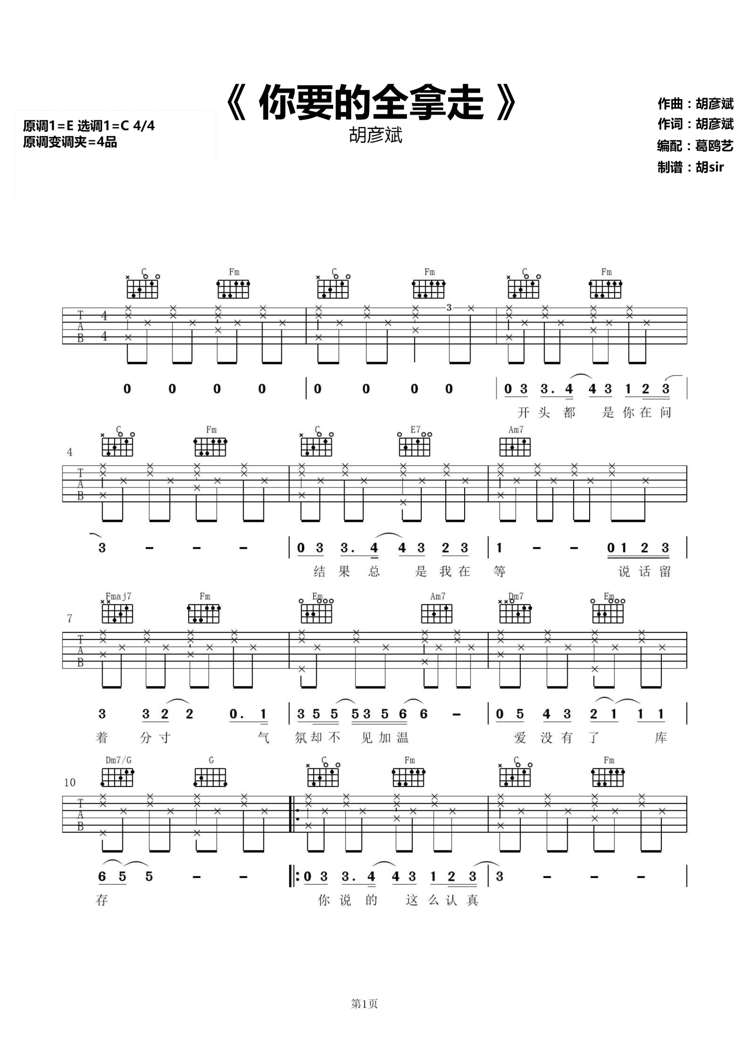 曲谱介绍: 胡彦斌《你要的全拿走》吉他谱,原调E,选调C,变调夹夹四品,胡彦斌一首原创虐心歌曲,一首R&B风格的歌曲,唱出了分手后的依恋,副歌部分即兴旋律很强,歌声完美融入旋律当中,独特的咬字,独具一格的节奏感,无不带给人耳目一新之感,让人听着十分过瘾。