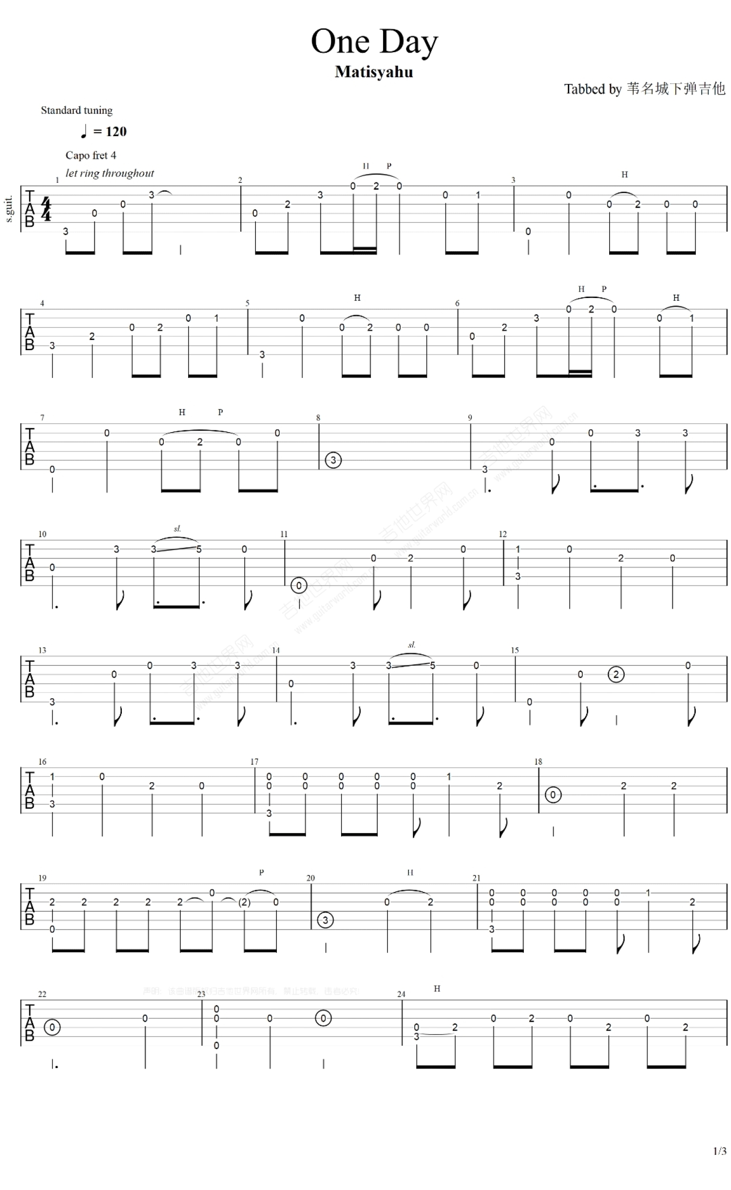 one day吉他谱 - MatisYahu - 吉他独奏谱