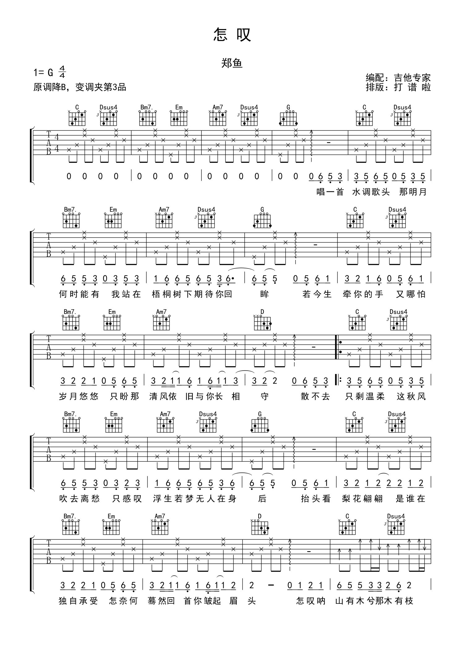 • 怎叹吉他谱 - 郑鱼 - G调吉他弹唱谱第1张