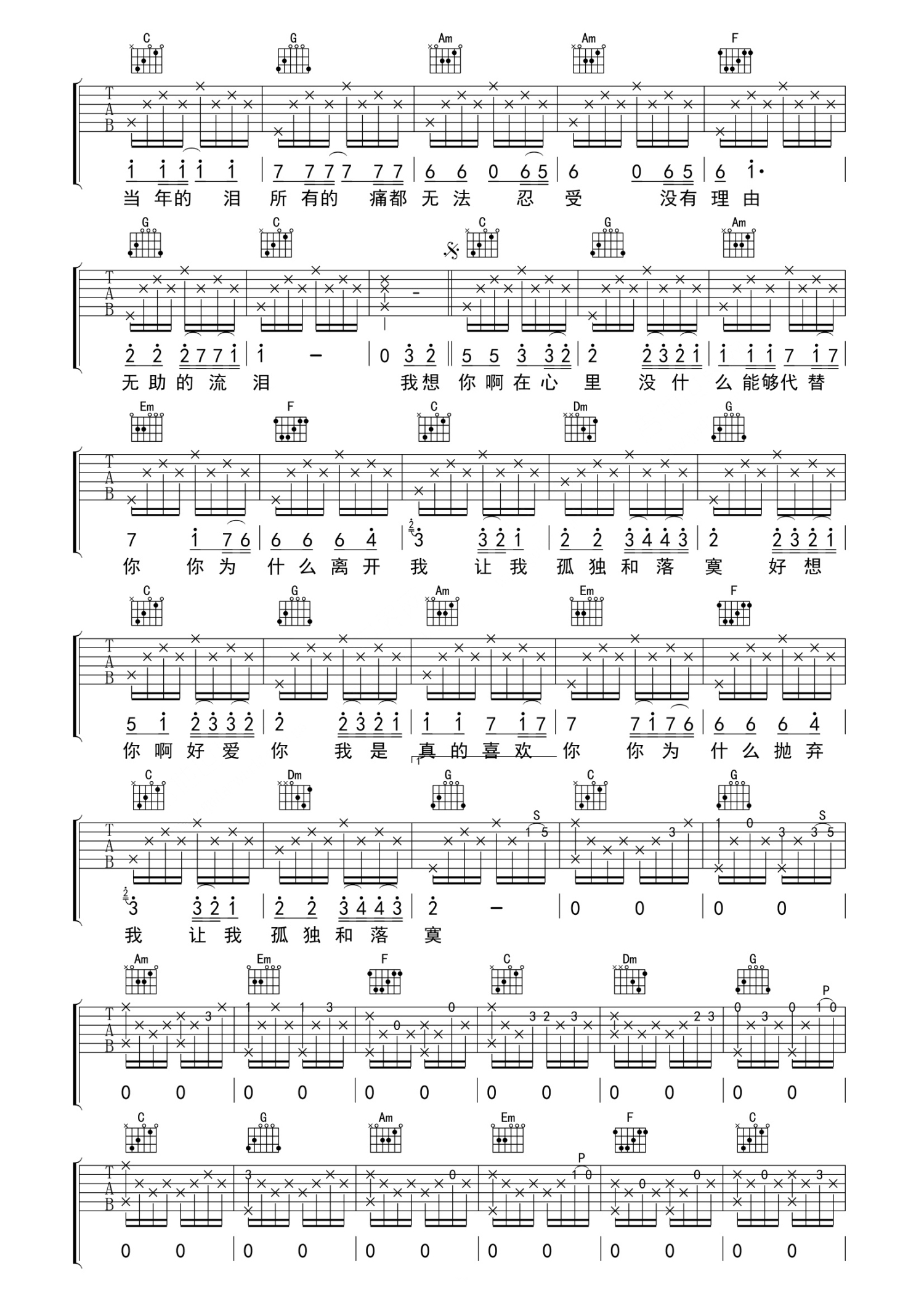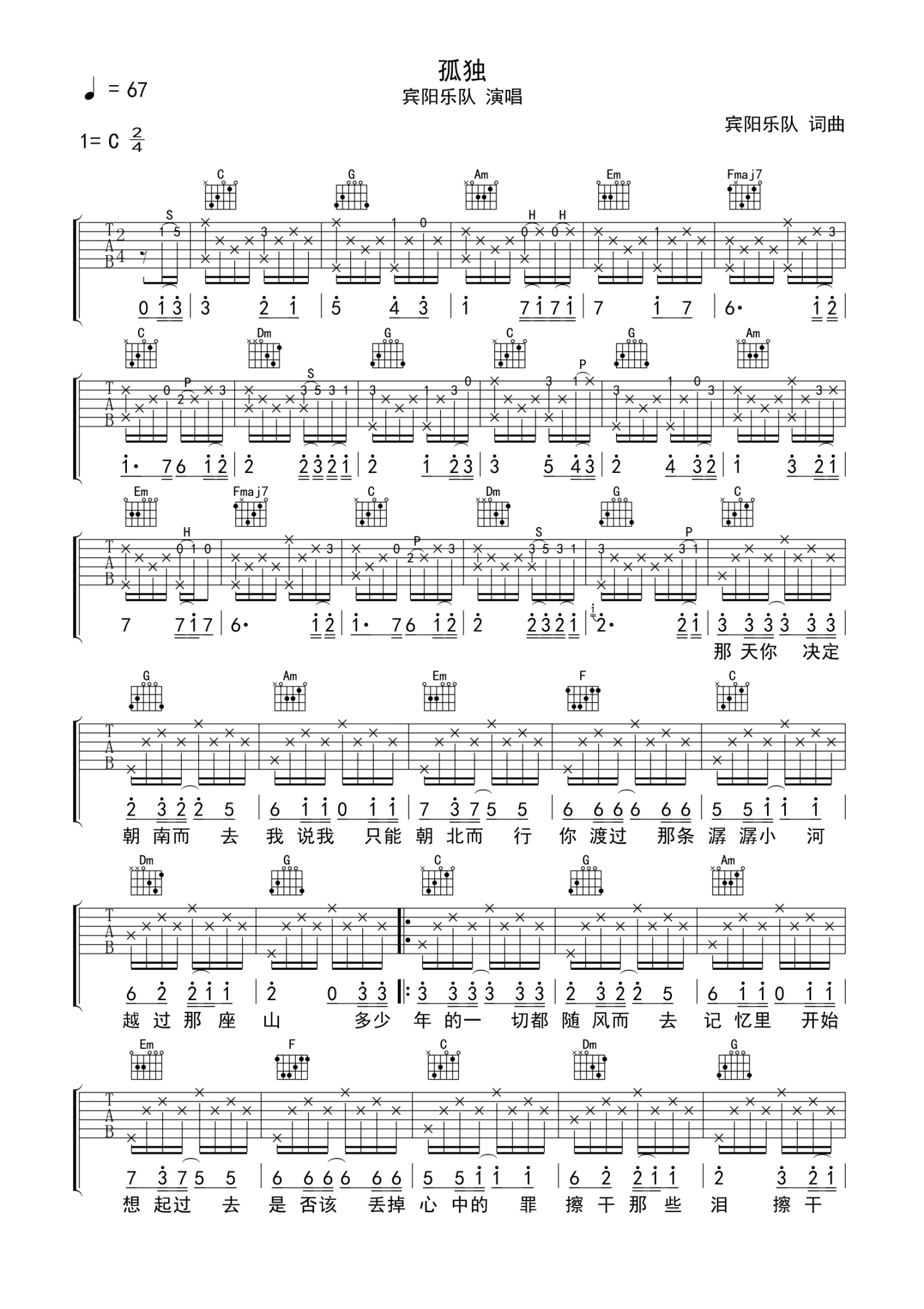 曲谱介绍: 宾阳乐队《孤独》吉他谱_C调吉他弹唱谱