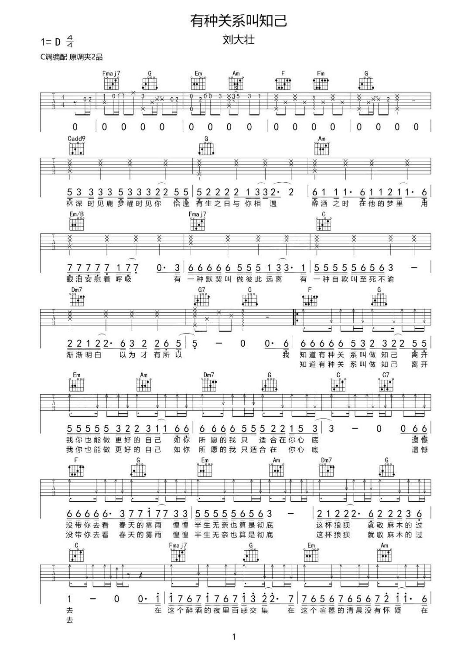 曲谱介绍: 刘大壮《有种关系叫做知己》吉他谱_C调吉他弹唱谱