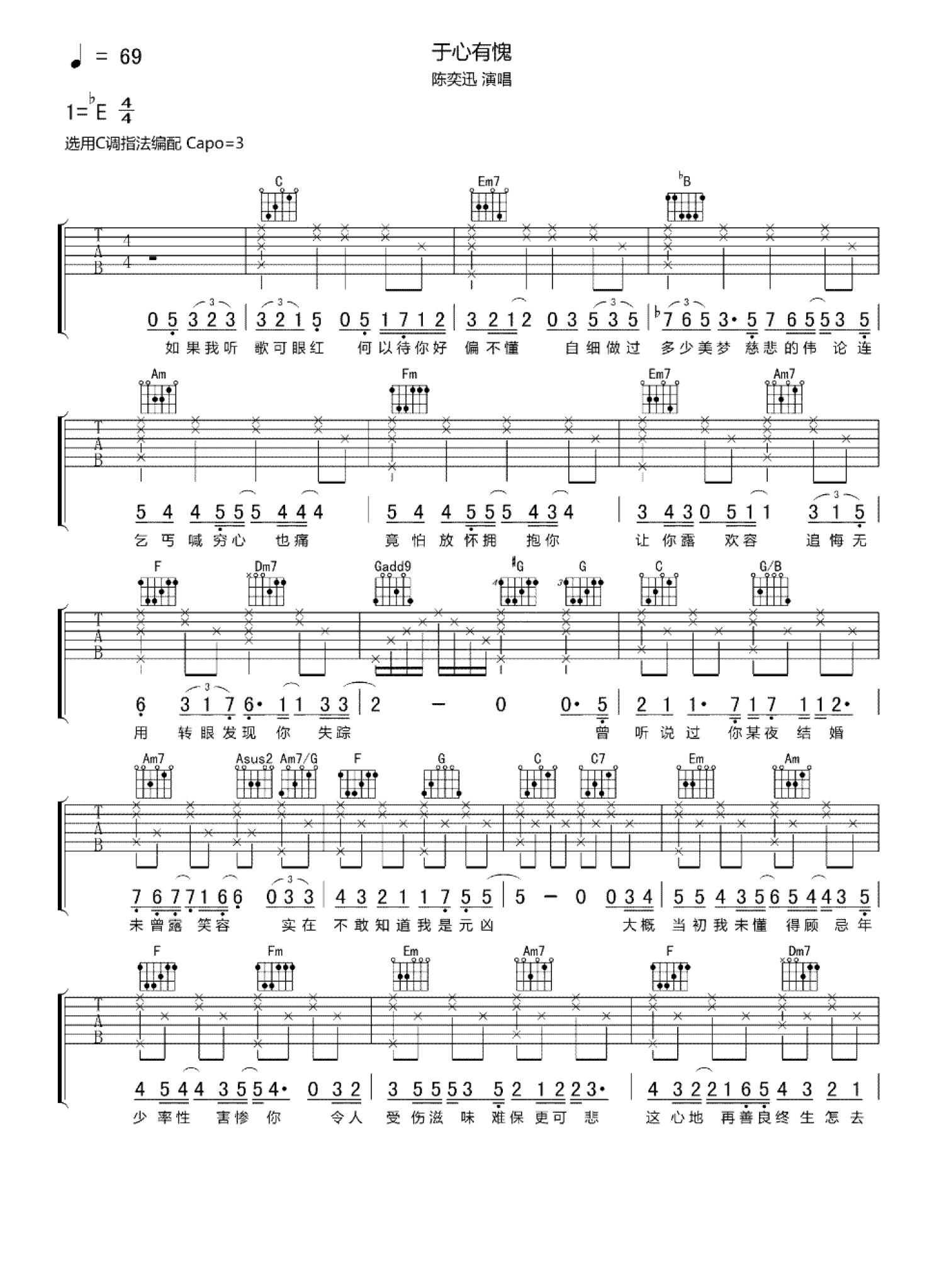 曲谱介绍: 《于心有愧》吉他谱,陈奕迅的一首粤语歌曲,唱出内心的挣扎苦闷。于心有愧六线谱,原调降E选用C调指法,变调夹夹三品,一首可以脑补出三万字虐文的粤语歌。有些大开大合的嘲讽,关于年少轻狂和自以为是的爱情,有些幡然醒悟的感觉在里面,同样也很喜欢这首歌的旋律。