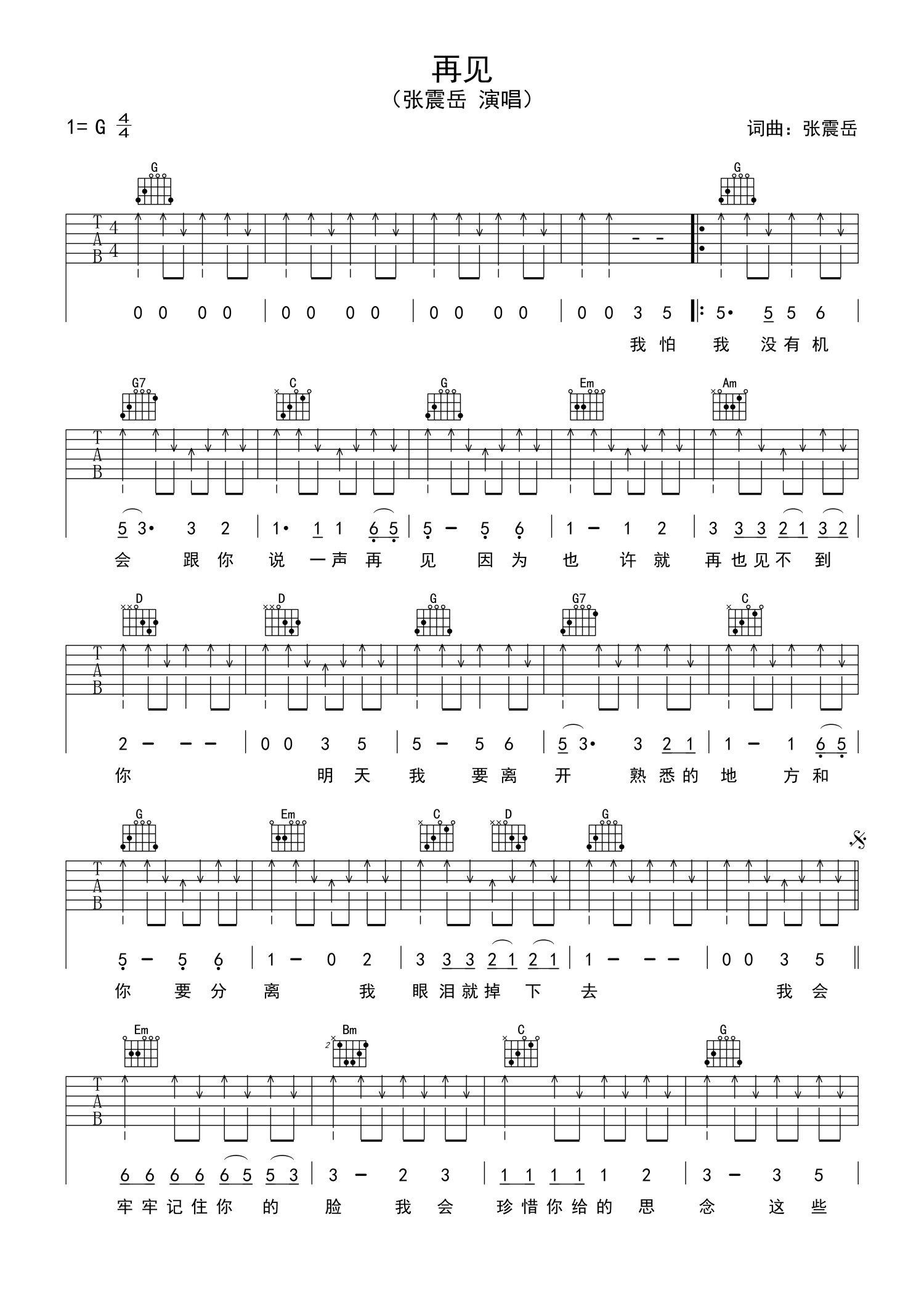 曲谱介绍: 张震岳《再见》吉他谱_G调吉他弹唱谱