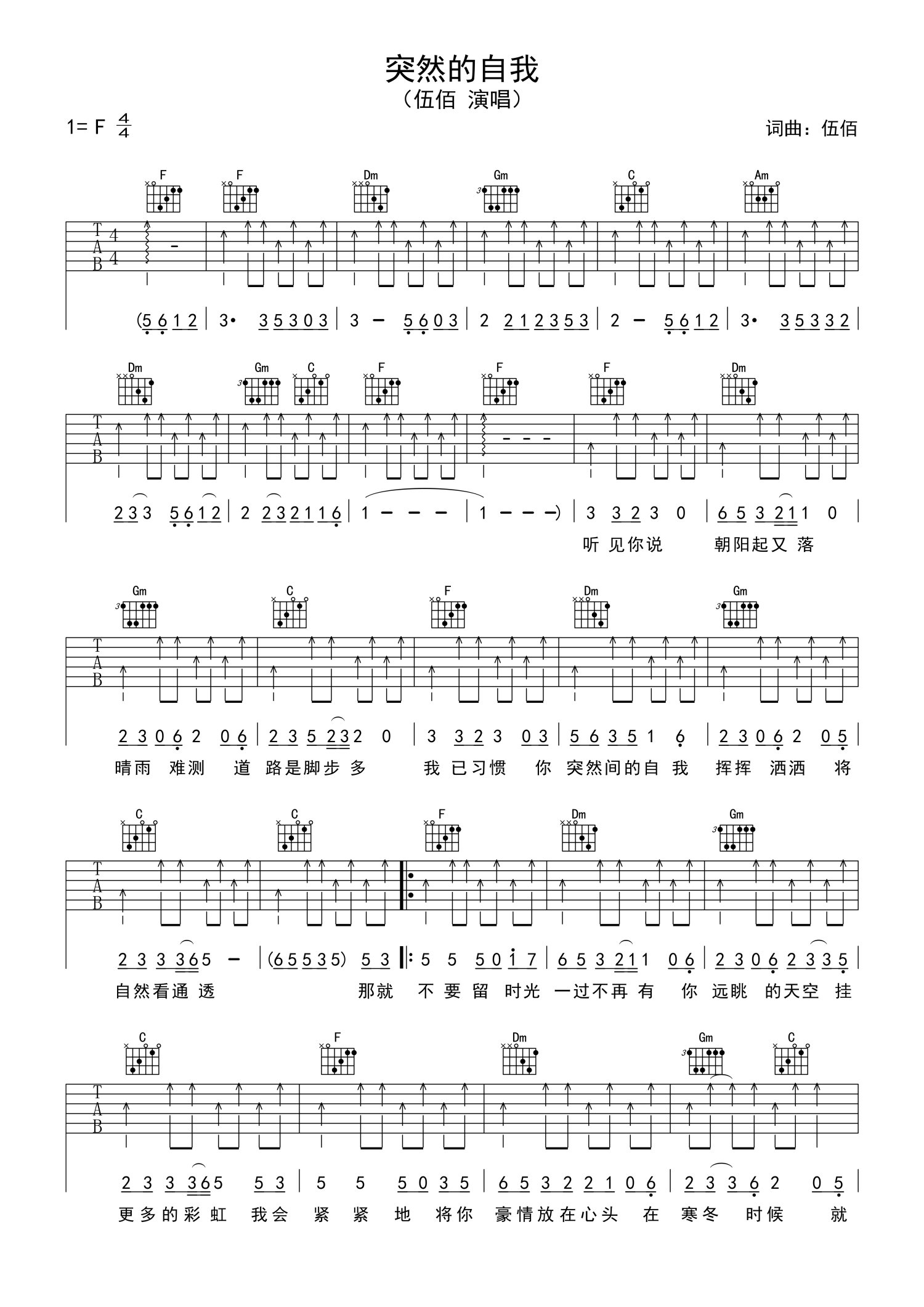 曲谱介绍: 伍佰《突然的自我》吉他谱_F调吉他弹唱谱
