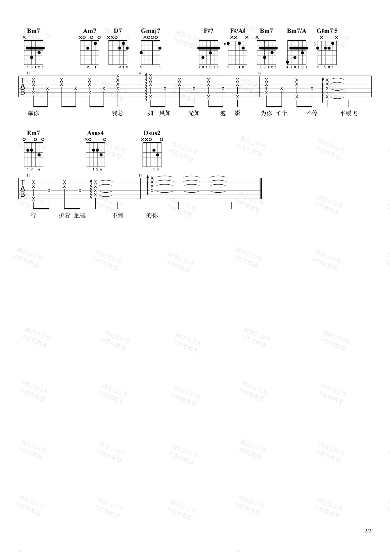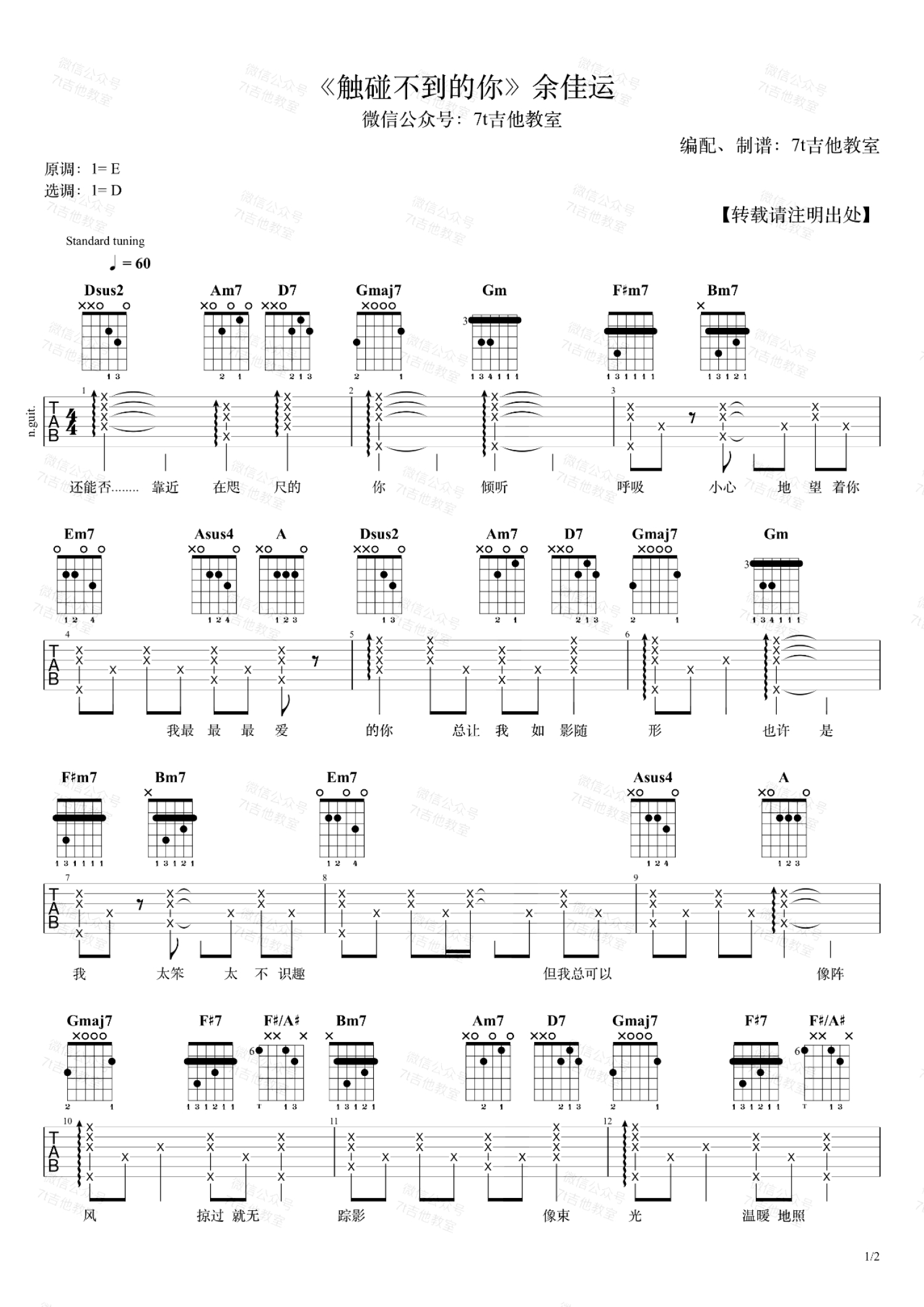 曲谱介绍: 触碰不到的你吉他谱,余佳运演唱,歌的原调是E大调,我用的是D大调的指法来编配。如果想弹原调,只需要夹变调夹第2品。和弦分析:这首歌用到的和弦知识挺丰富的,很值得分析一下!首先讲讲比较基本的,把一些三和弦丰富一下,一级用了sus2;二级、三级、六级大部分用了小七;四级用了maj7;五级用了sus4。整首歌用了大量的251离调,主要都用在了四级上面,Am7→D7→Gmaj7,是把四级Gmaj7当成临时一级,Am7和D7分别是它的二级和五级。同时,歌曲也用了四级小和弦Gm。副歌里面F#7→F#/A#→Bm7这是一个简单常见的副属和弦用法,本来三级是一个小和弦F#m,这里它作为Bm7的副属和弦,变成了F#7,后面的F#/A#其实跟F#7是一样的,只是用了转位,更加丰富,嫌麻烦的话其实只用F#7就可以了。