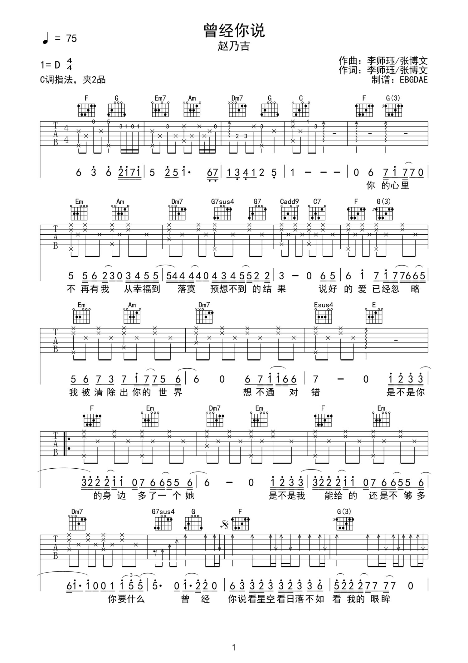• 曾经你说吉他谱 - 赵乃吉 - C调吉他弹唱谱第1张