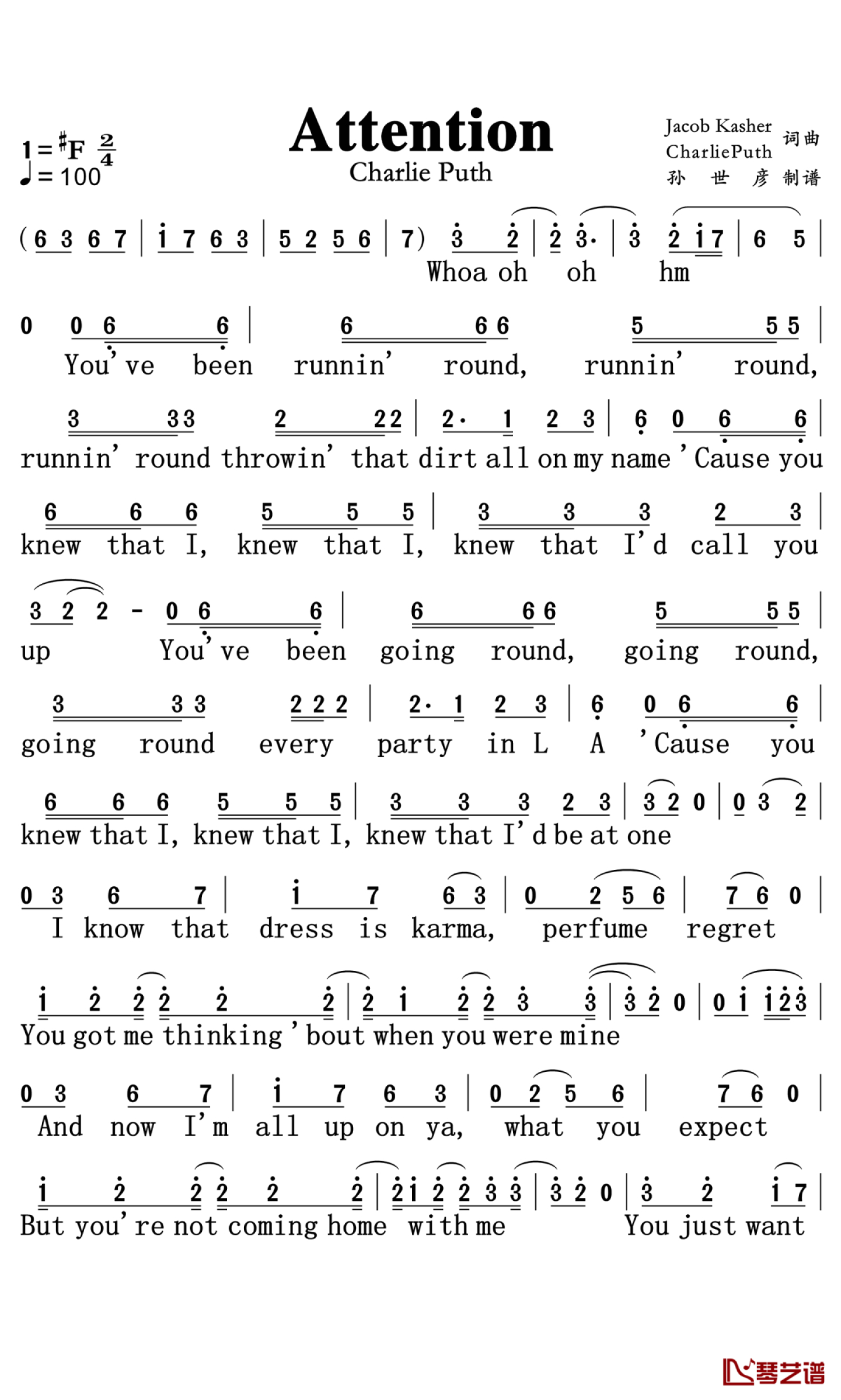曲谱介绍: Charlie Puth《attention》歌词_简谱