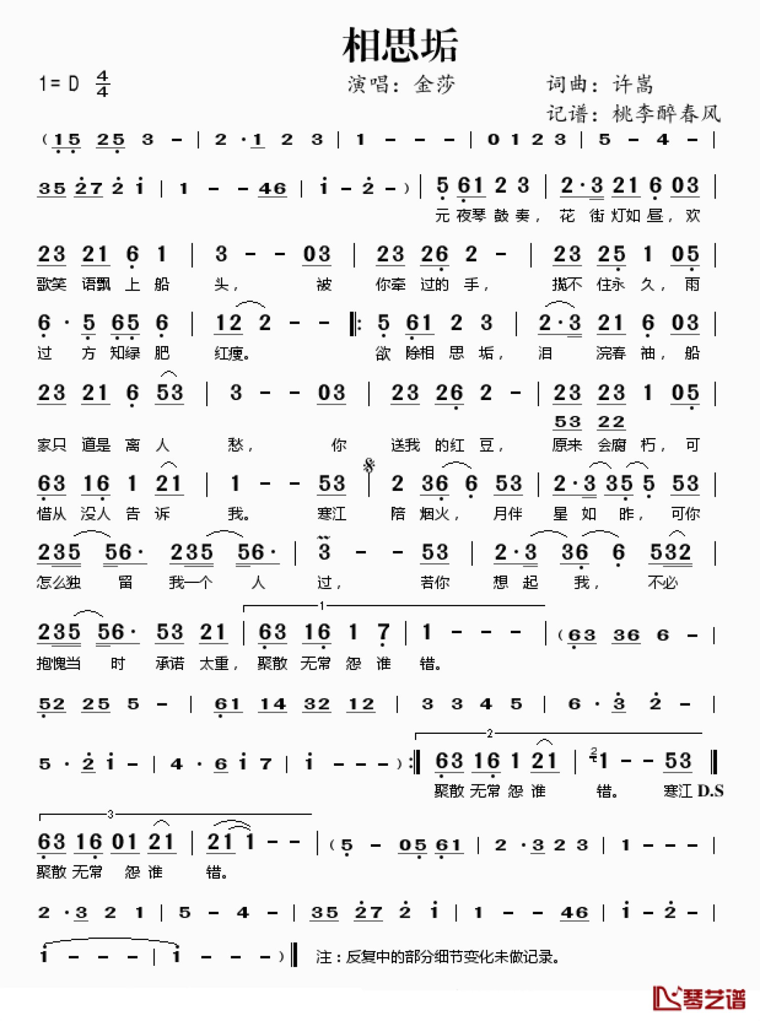 相思垢简谱 - 金莎