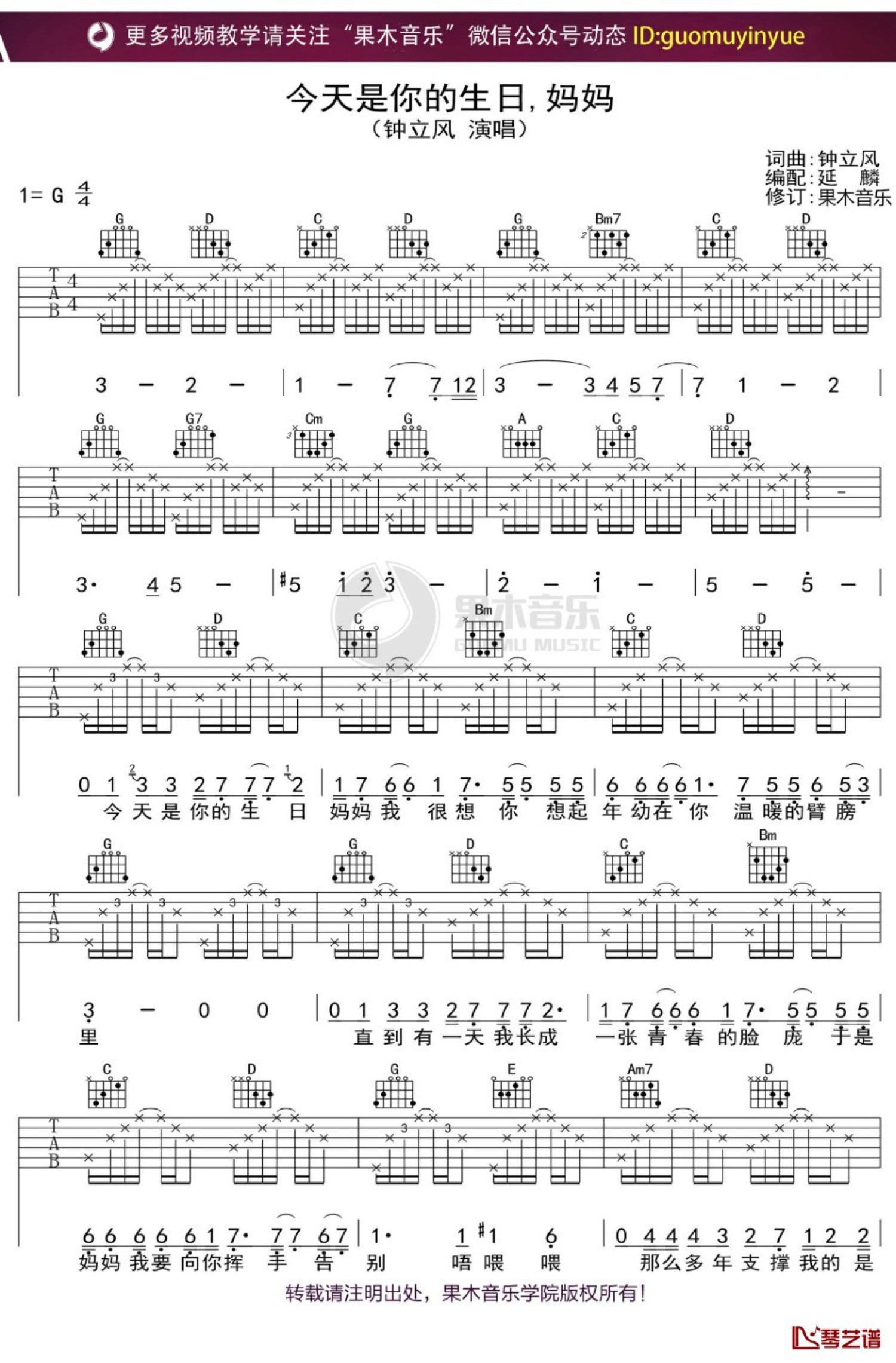 今天是你的生日,妈妈吉他谱 - 钟立风 - G调吉他弹唱谱