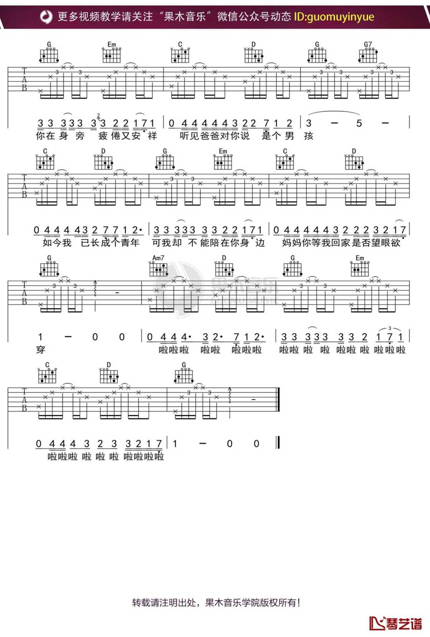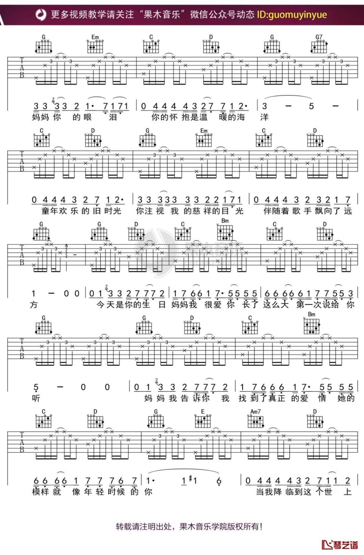 曲谱介绍: 钟立风《今天是你的生日,妈妈》吉他谱_G调吉他弹唱谱