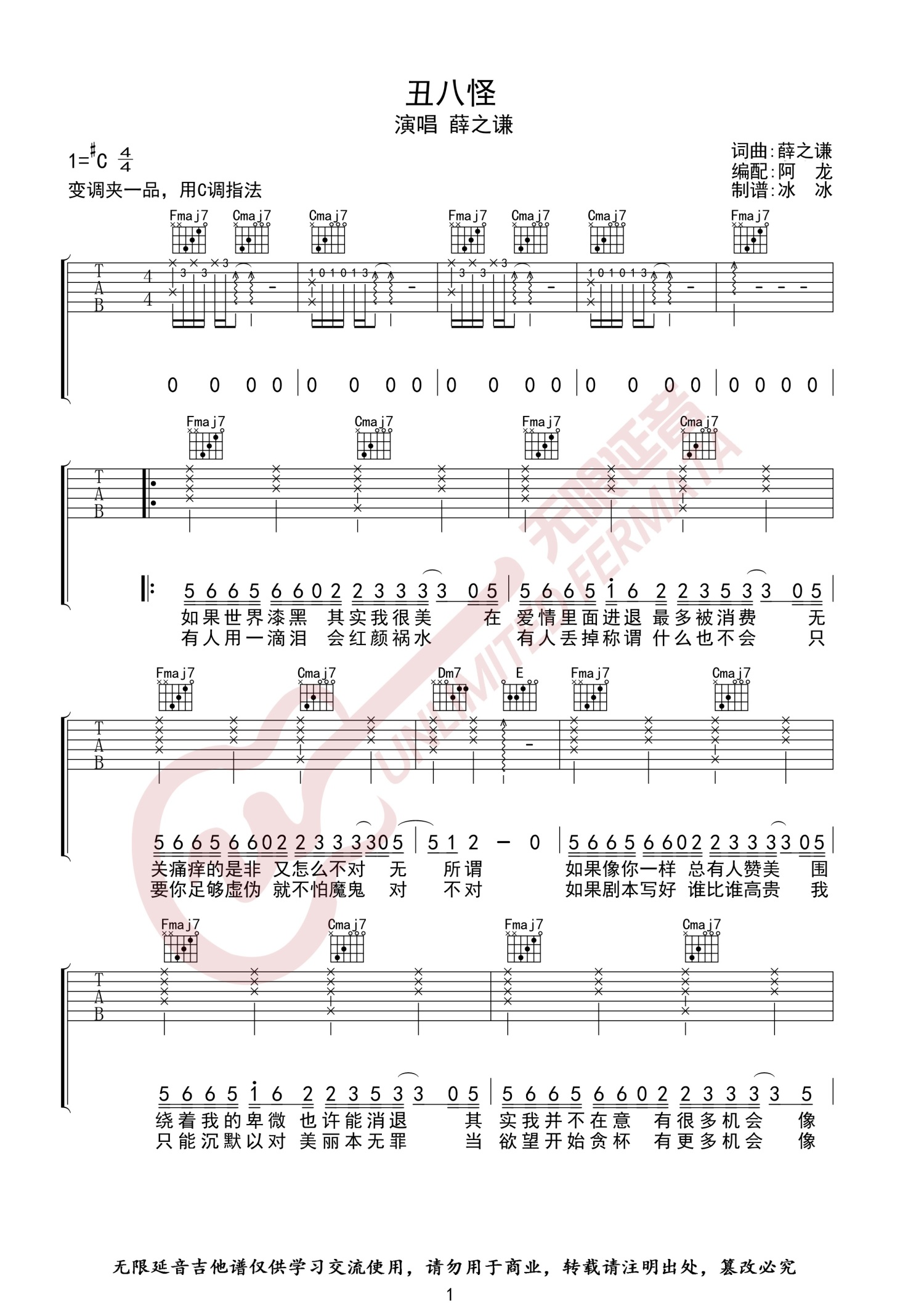 丑八怪吉他谱 - 薛之谦 - C调吉他弹唱谱