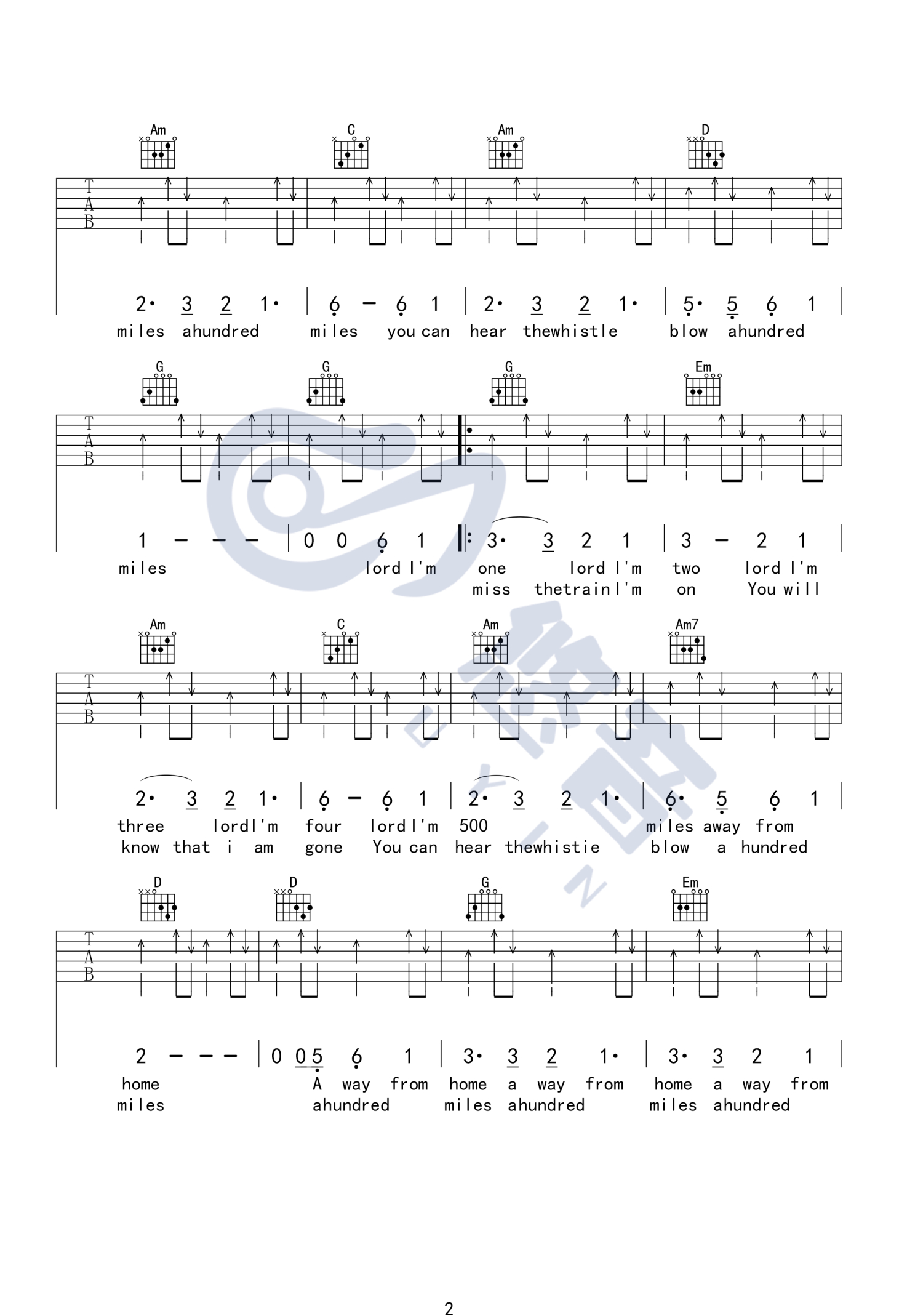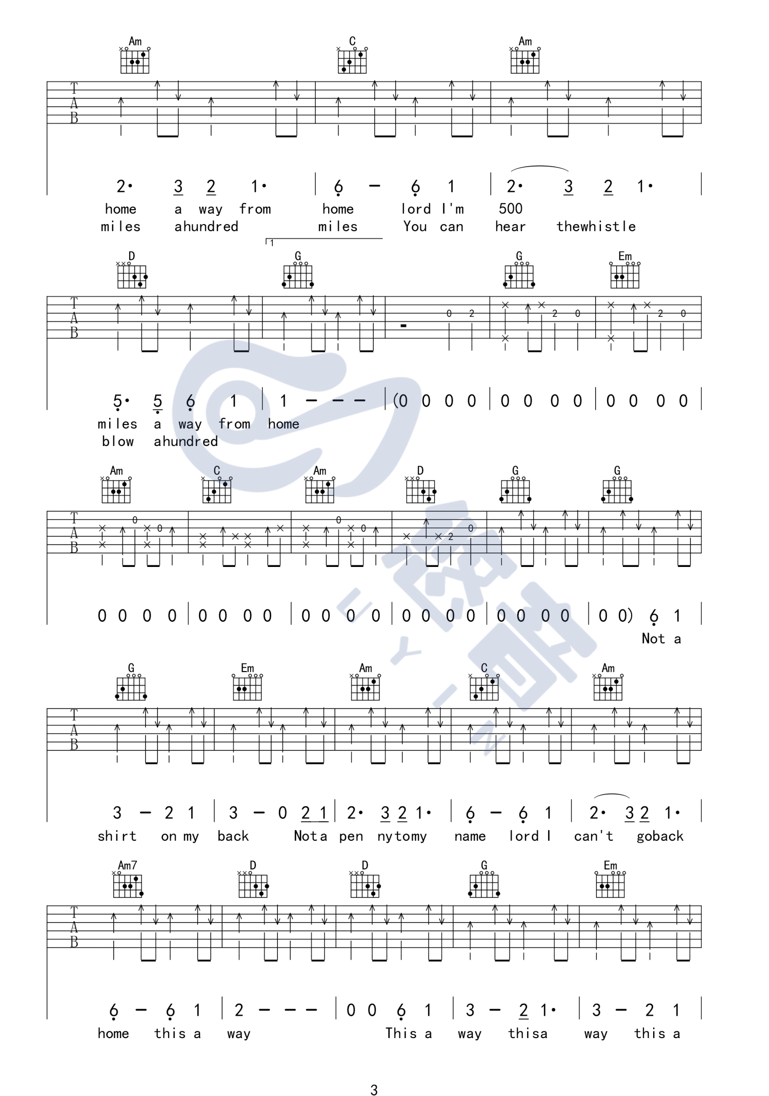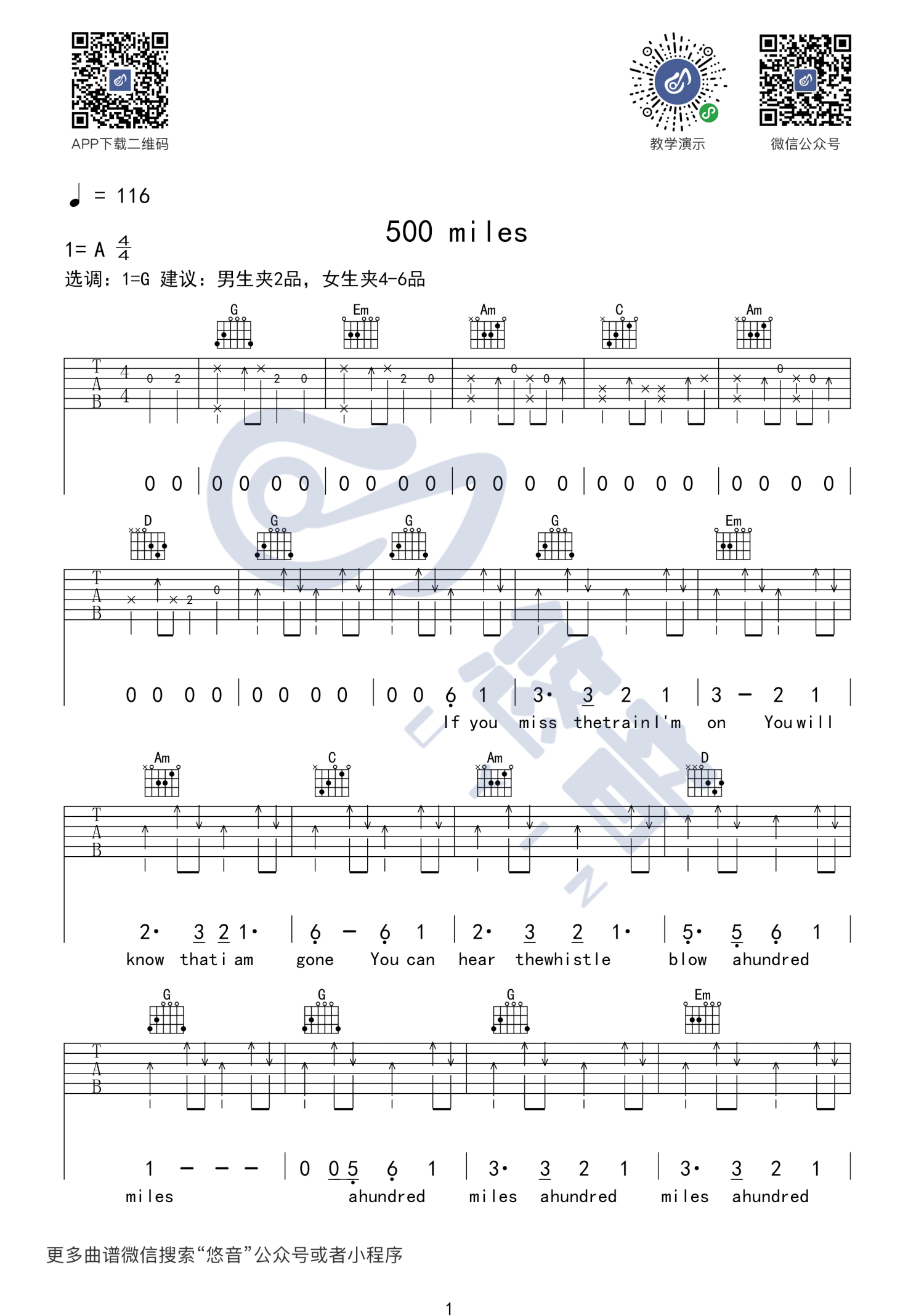 曲谱介绍: 醉乡民谣《Five Hundred Miles》吉他谱_G调吉他弹唱谱