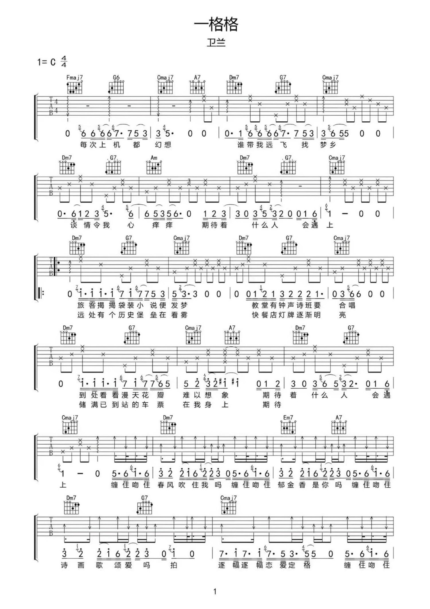 曲谱介绍: 卫兰《一格格》吉他谱_C调吉他弹唱谱