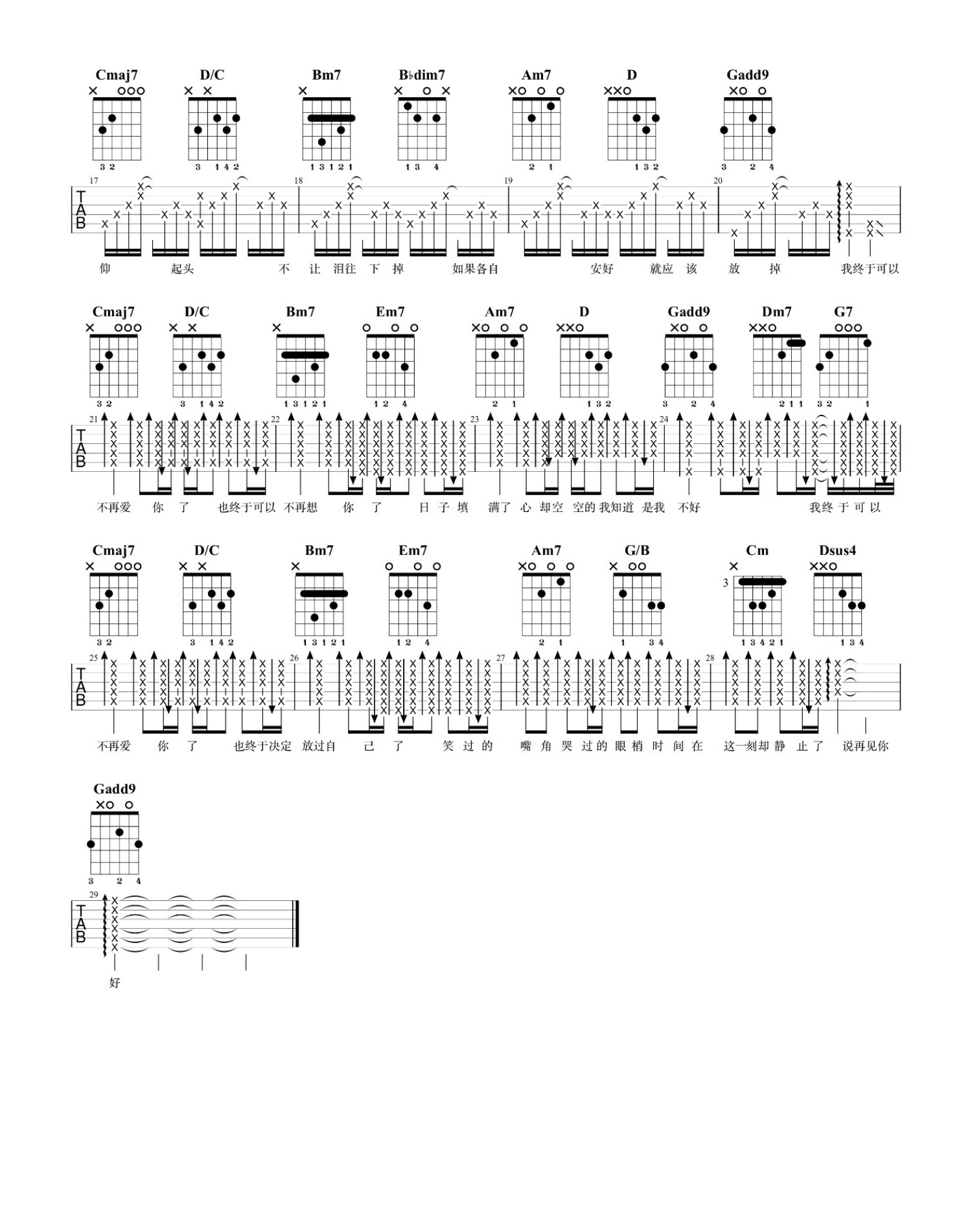 曲谱介绍: 金玟岐《再见你好》吉他谱,G调指法弹唱谱,一曲温柔的歌声抚慰那些受伤的灵魂,老师编配说明:这首歌的原调是C#大调,视频里我是用G大调的指法来弹的,适合音域比较低的男生,音域高的男生或者音域低的女生可以根据自己的情况夹变调夹~前奏第1小节我是用拇指按6弦3品,这样在弹后面音符的时候,可以保持根音不会断音,如果用中指来按也是可以,不过这种方式手会比较累主歌使用了16分音符为主的分解和弦,弹奏速度比较快,新手如果觉得难的话,可以改成常用的8分音符节奏型哦,类似T3231323这种也可以的~