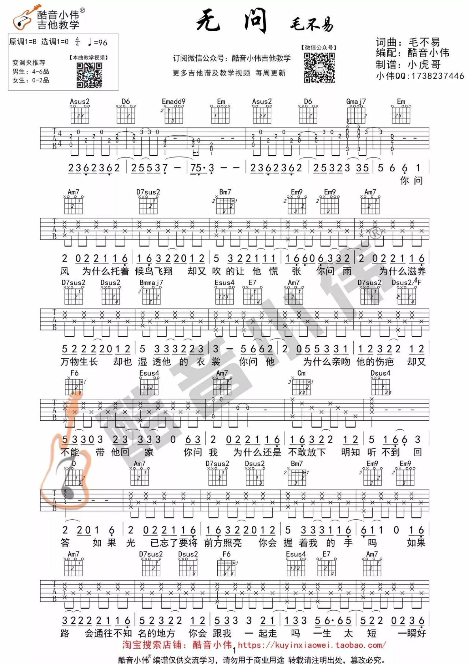 曲谱介绍: 毛不易《无问》,整首歌虽然句句是问,内心却明知无从答案。毛不易总用大面积留白的唱法,给听者留下一种莫名的感触,引人想象无穷,让我们看到他心中对爱人最真挚的温柔和最深切的挂念。一生太短,一瞬好长,我们哭着醒来,又哭着遗忘,幸好啊,你的手曾落在我的肩膀......