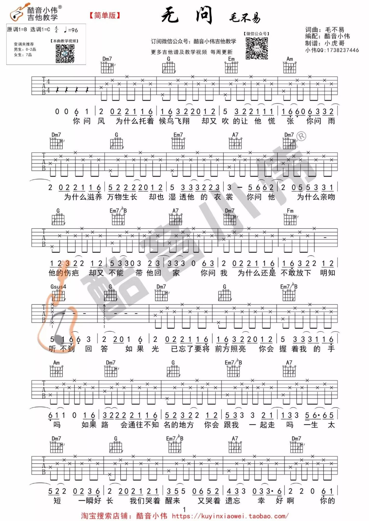 无问吉他谱 - 毛不易 - G调吉他弹唱谱 - 附c调简单版