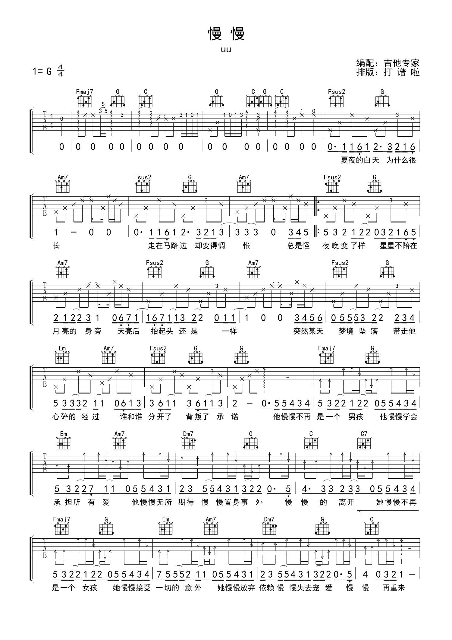曲谱介绍: uu《慢慢》吉他谱_G调吉他弹唱谱