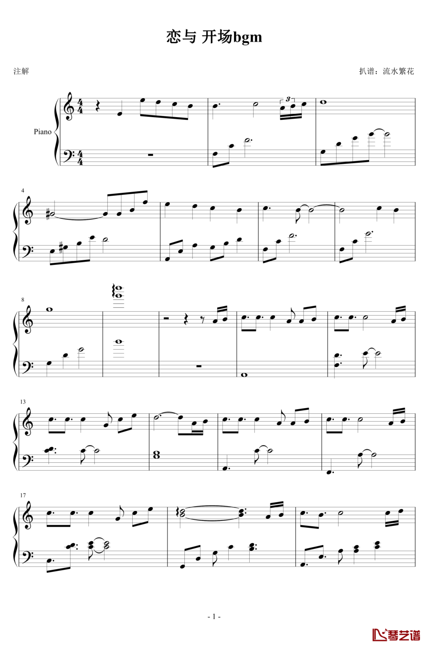 曲谱介绍: 恋与制作人《开场音乐》钢琴谱