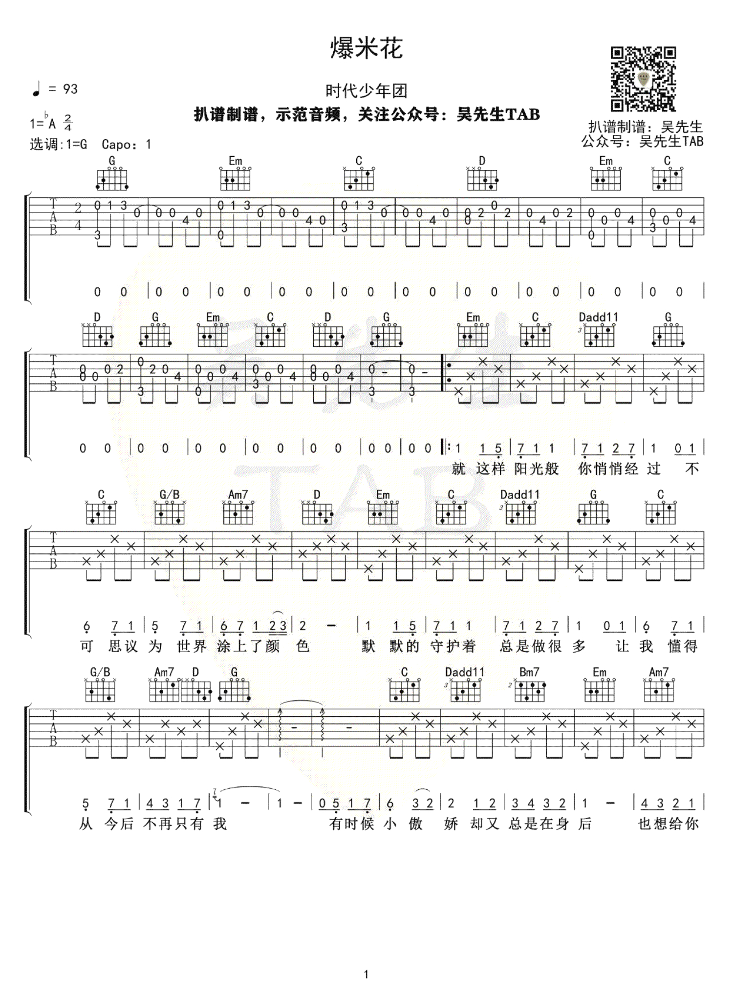 曲谱介绍: 爆米花吉他谱,时代少年团演唱,一首专属于少年的小情歌。爆米花吉他六线谱,原调降A,选用G调指法编配,Capo夹一品,三张弹唱图片谱。吴先生编配分享,打谱啦网整理上传。欢快甜蜜而直白真挚,将所有天真的愿景、浪漫的想象以及由衷的感激都唱进了歌里,签收人写着每一个百万分之一的你的名字。爆米花们,未来也请多多指教!