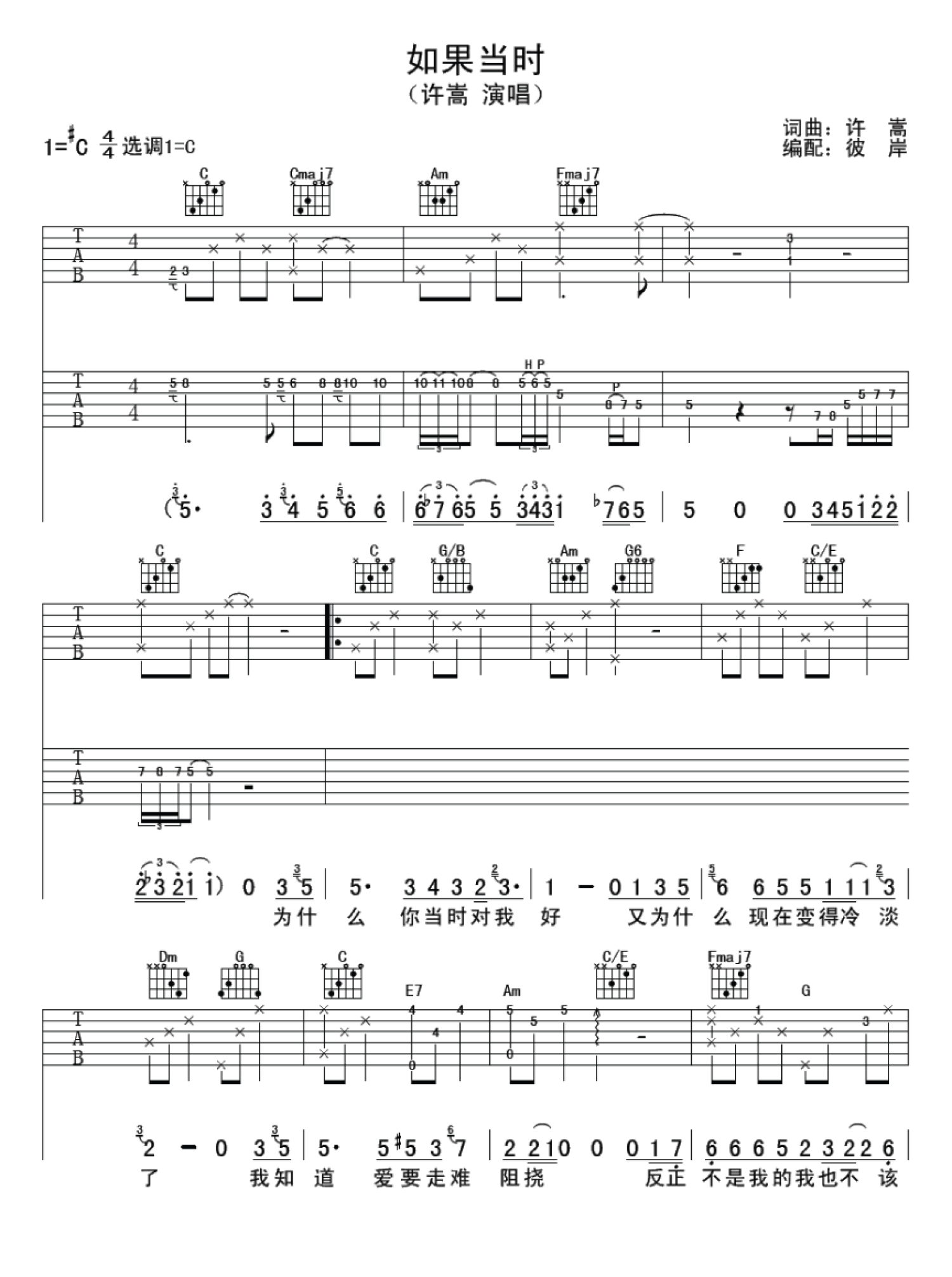 曲谱介绍: 许嵩《如果当时》吉他谱六线谱【高清版】