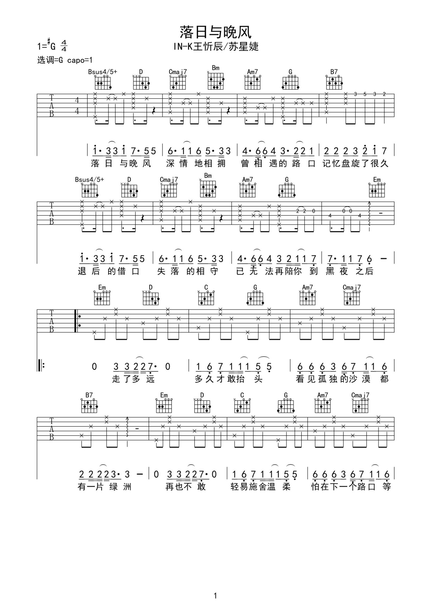 • 落日与晚风吉他谱 - 王忻辰/苏星婕 - G调吉他弹唱谱第1张