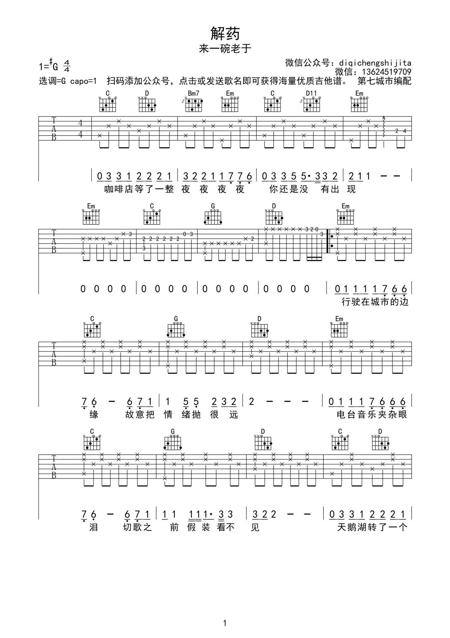 • 解药吉他谱 - 来一碗老于 - G调吉他弹唱谱第1张
