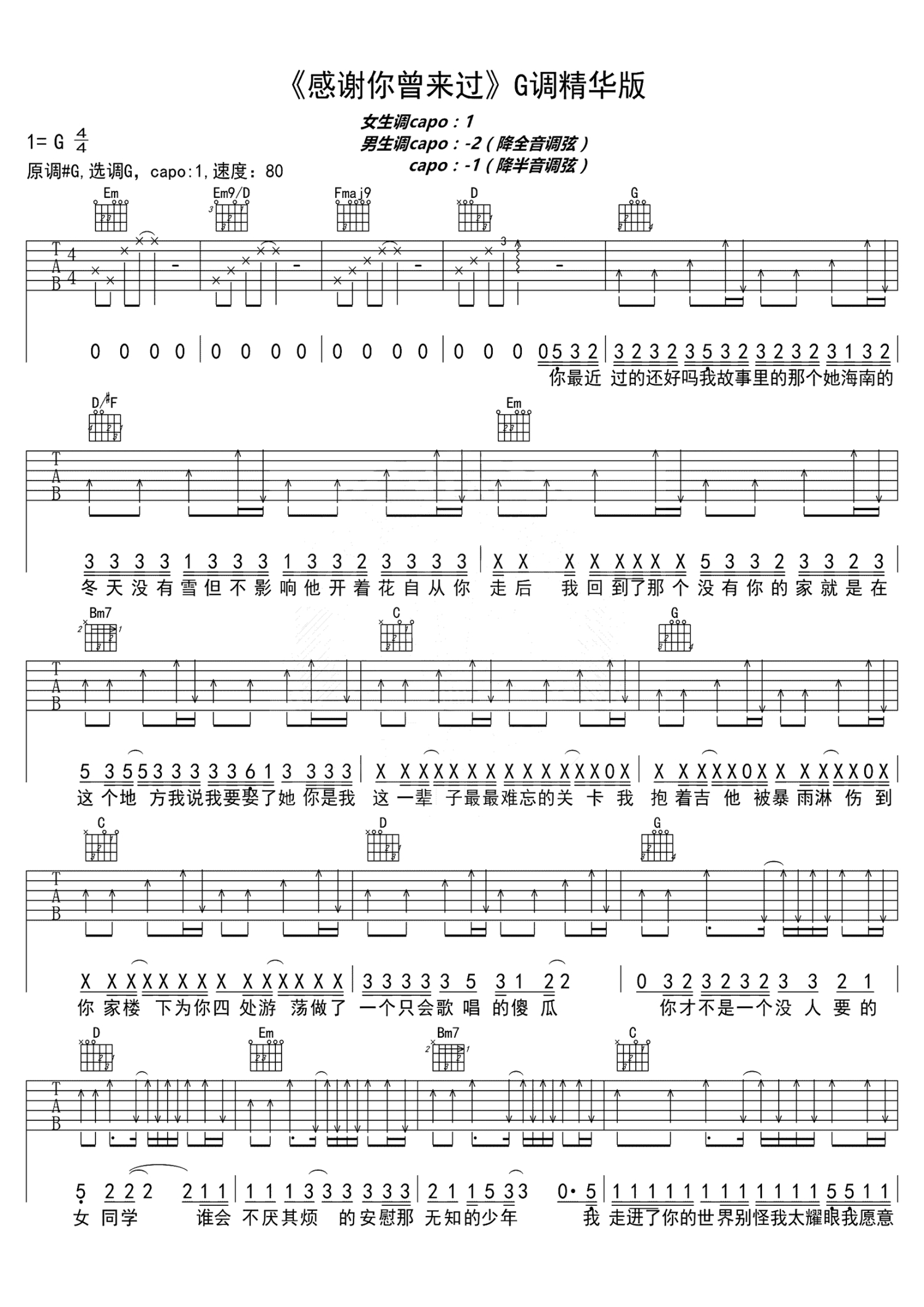 曲谱介绍: 感谢你曾来过吉他谱,Ayo97阿涵演唱,G调指法精华版编配,女生变调夹夹一品,男生调降半音或降全音。生命中总会有很多亲爱的路人,他可能是亲人,可能是爱人,也可能是朋友,同事等各种人,最初她是陌生的路人,然后变成最亲爱的人,最后擦肩而过,成为彼此最亲爱的路人。你来过我的世界,我念你曾经来过。