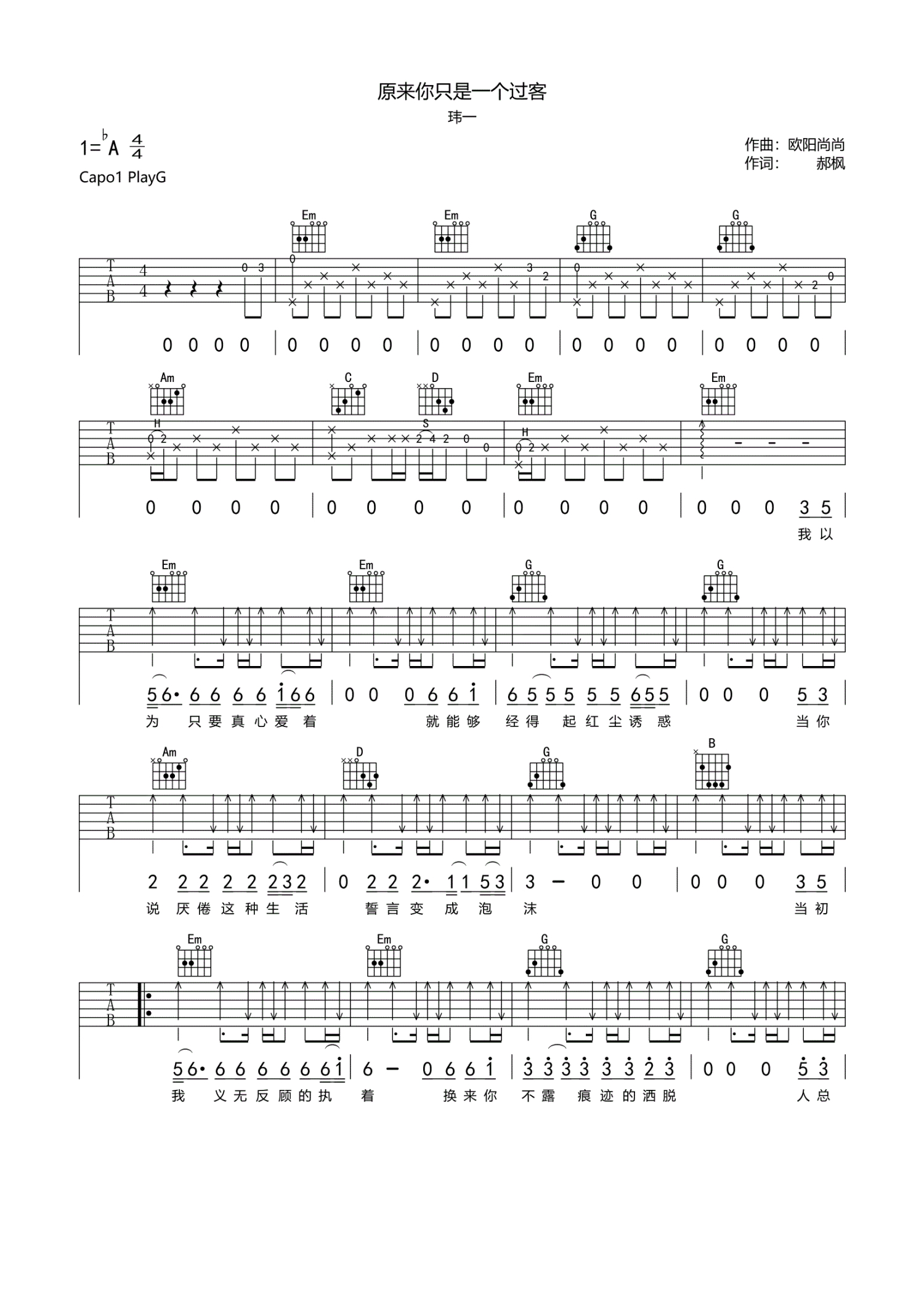 • 原来你只是一个过客吉他谱 - 玮一 - G调吉他弹唱谱第1张