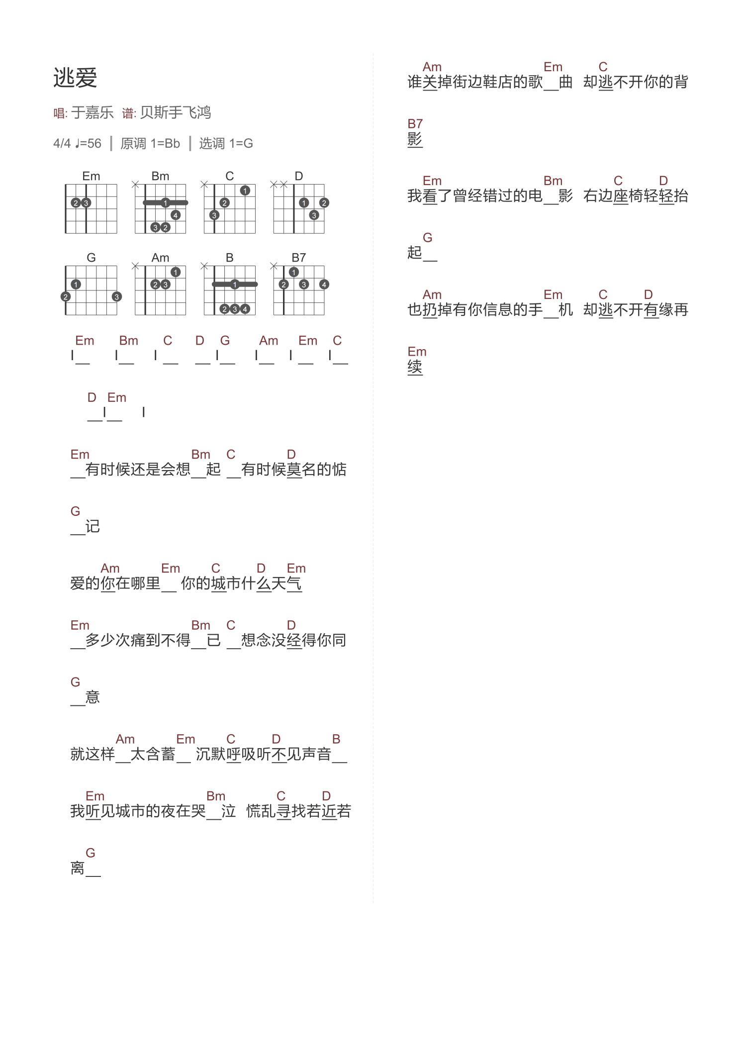 逃爱吉他谱 - 于嘉乐 - G调吉他弹唱谱 - 和弦谱