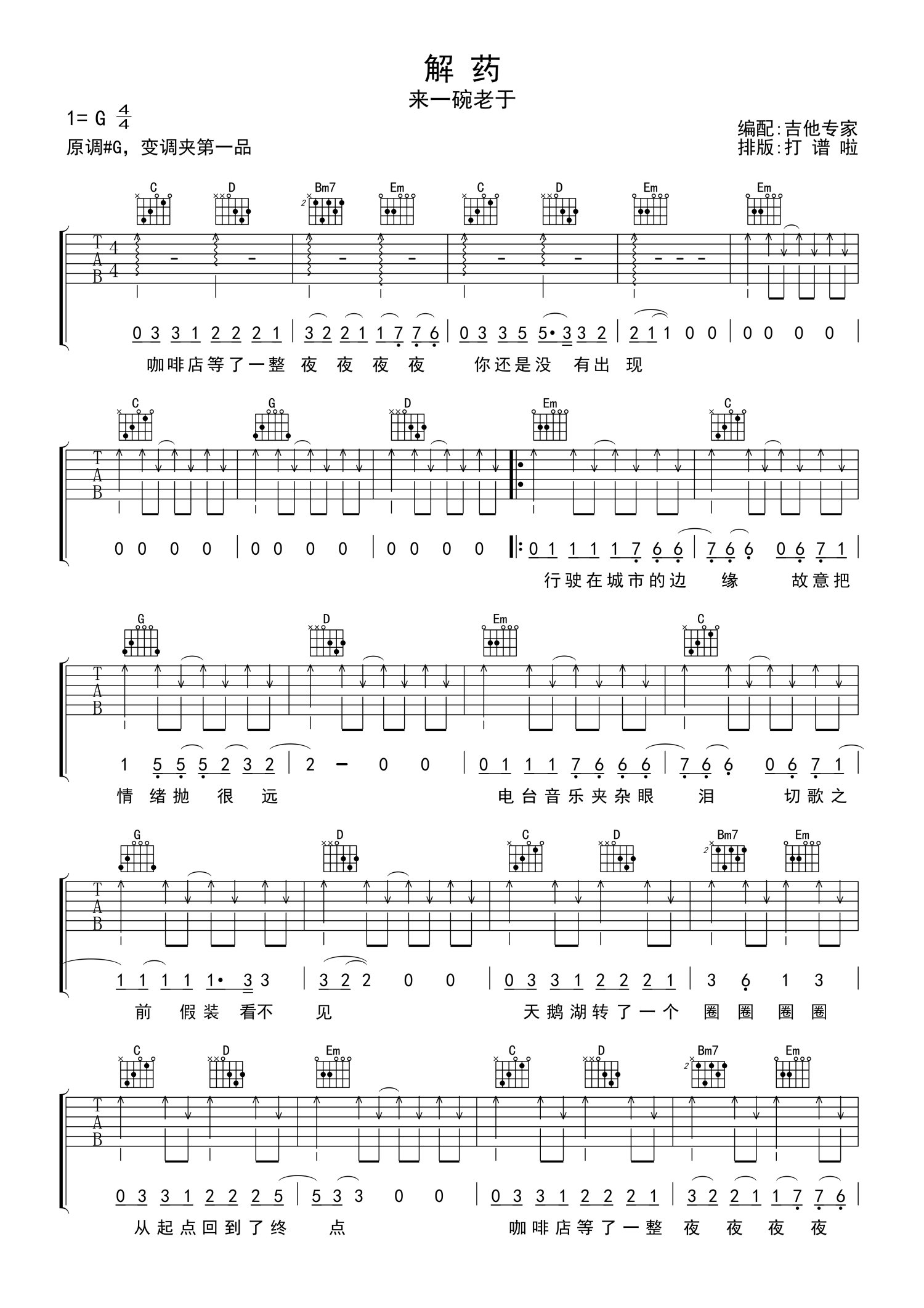 • 解药吉他谱 - 来一碗老于 - G调吉他弹唱谱第1张