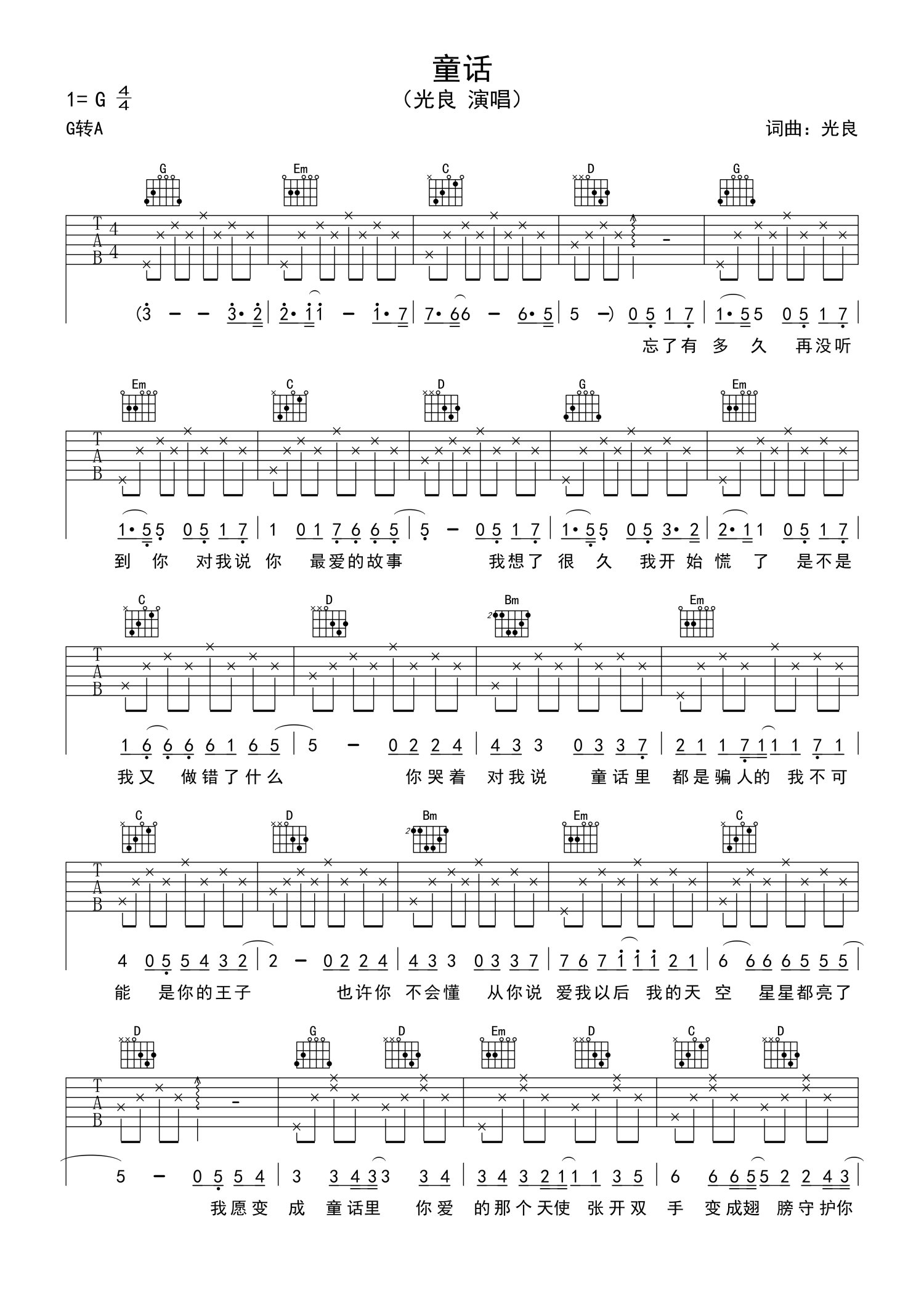 • 童话吉他谱 - 光良 - G调吉他弹唱谱 - 新手简单版第1张