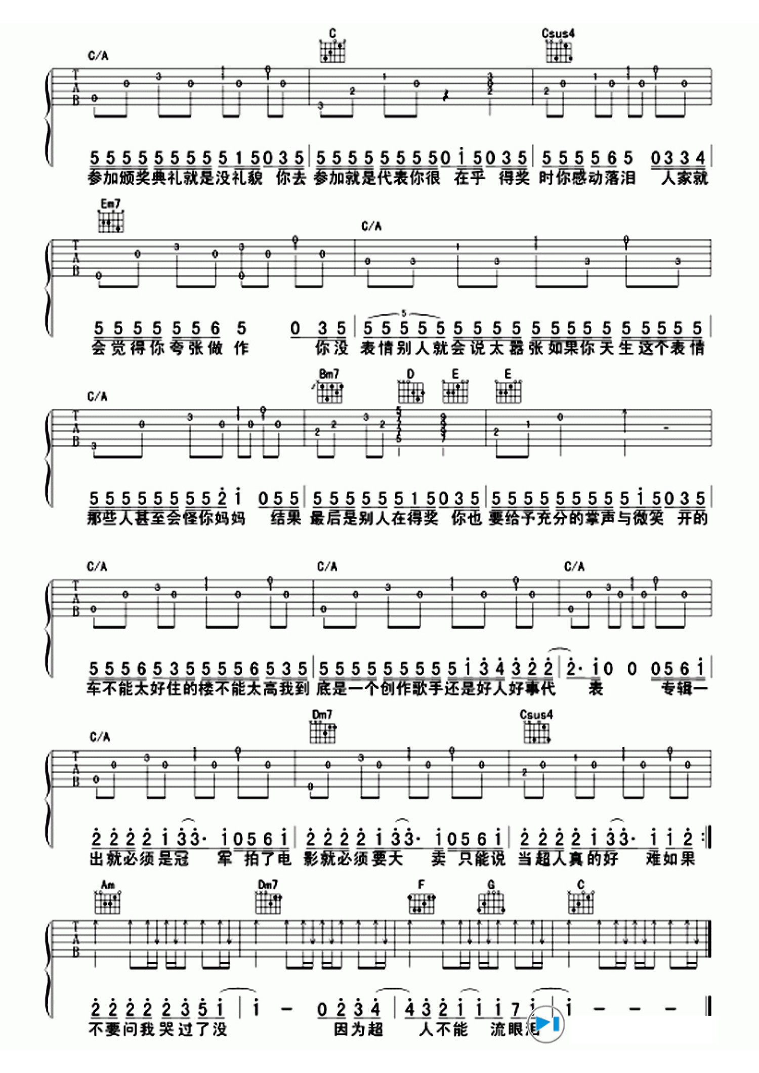曲谱介绍: 周杰伦《超人不会飞》吉他谱_C调吉他弹唱谱