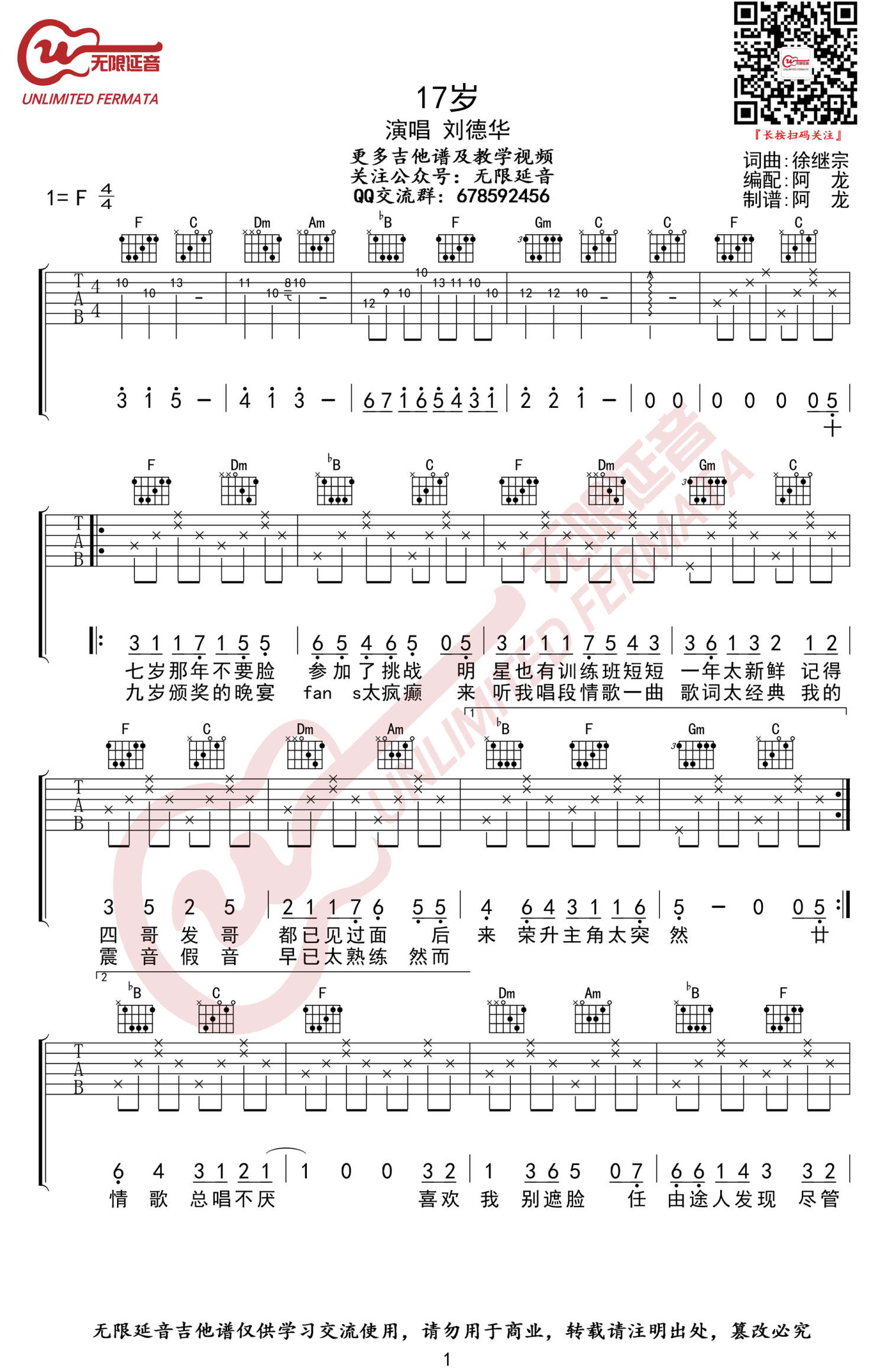 曲谱介绍: 刘德华《十七岁》吉他谱_F调吉他弹唱谱