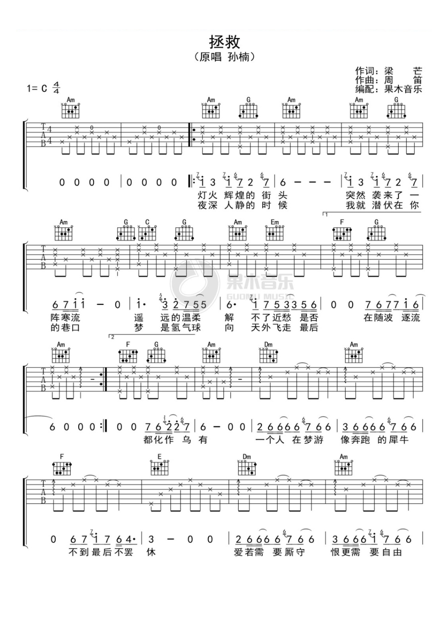 曲谱介绍: 孙楠《拯救》吉他谱_C调吉他弹唱谱