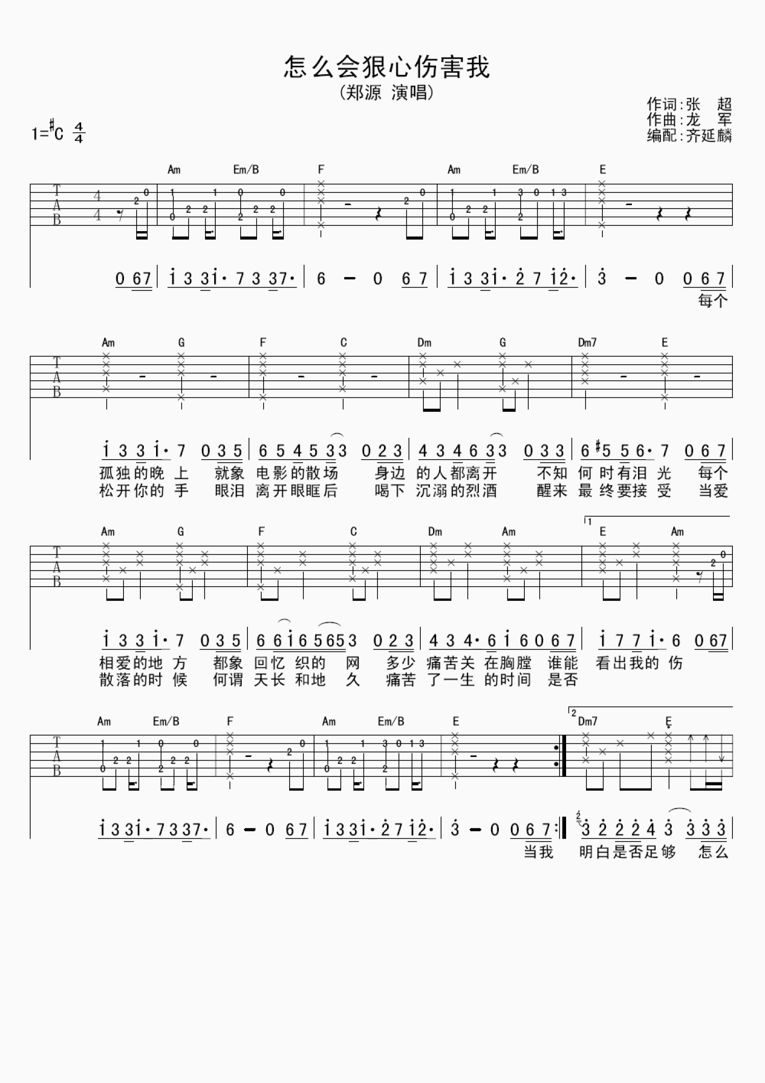 曲谱介绍: 郑源《怎么会狠心伤害我》吉他谱_C调吉他弹唱谱