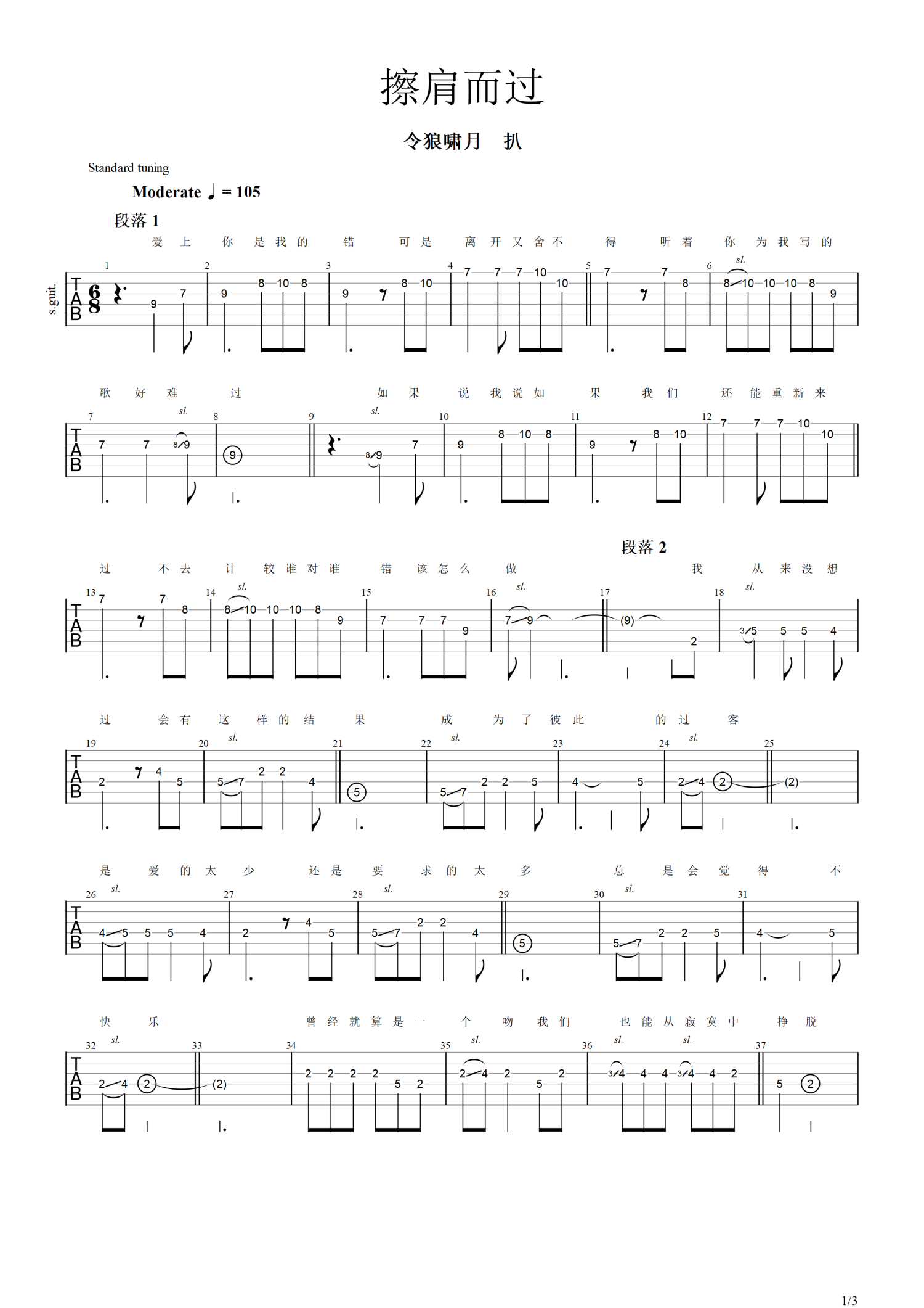 • 擦肩而过吉他谱 - 宇桐非 - C调吉他独奏谱第1张