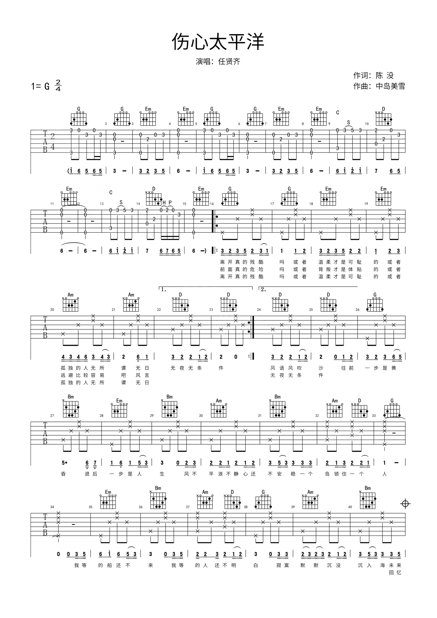 曲谱介绍: 任贤齐《伤心太平洋》吉他谱_G调吉他弹唱谱