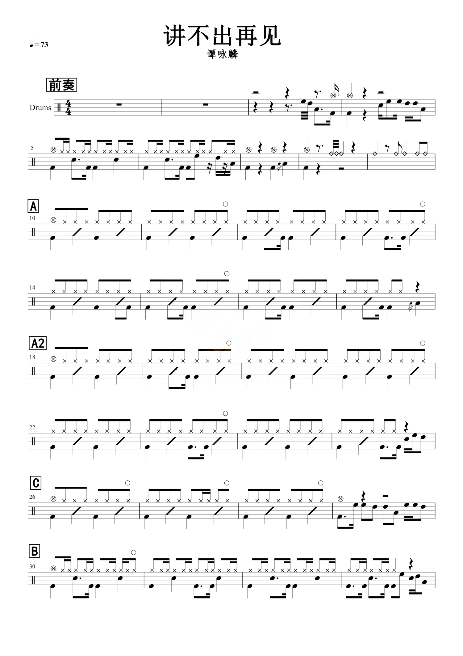 曲谱介绍: 谭咏麟《讲不出再见》鼓谱_架子鼓谱